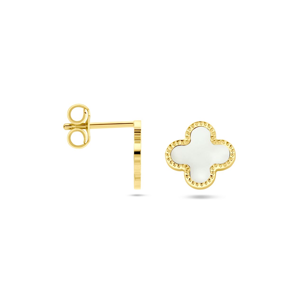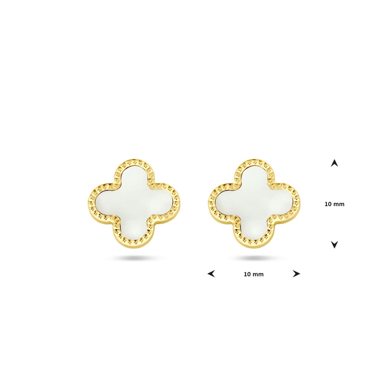 14k Geelgouden oorknoppen uitgevoerd met een bloem en parelmoer. De oorknoppen hebben een afmeting van 10x10mm.