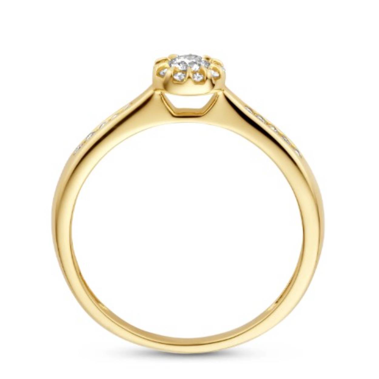 Een echte eyecatcher is deze 14K geelgouden ring met maar liefst 20 briljant geslepen diamantjes. De band heeft een doorsnede van 4,95 mm en de steentjes samen een karaatgewicht van 0.14ct en 0.13ct. Schitterend op zichzelf maar ook mooi te combineren met andere ringen uit onze collectie.