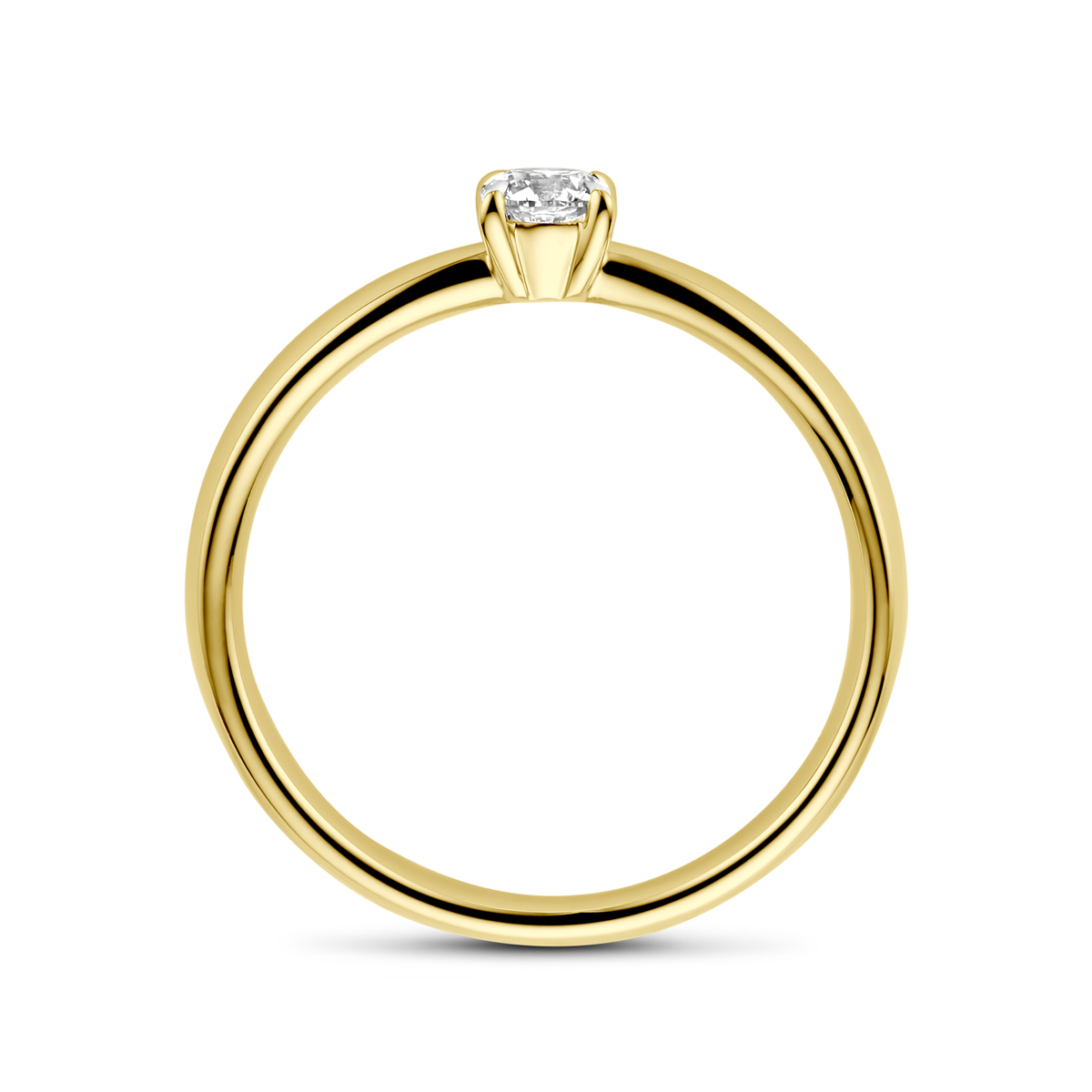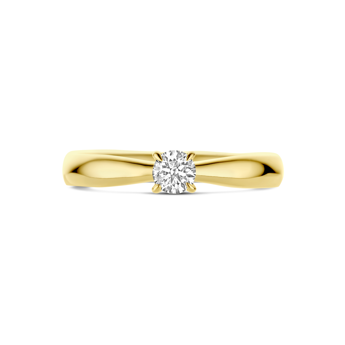 14k Geelgouden aanzoeksring uitgevoerd met diamant. De steenmaat is 4mm en het diamantgewicht is 0.25ct.