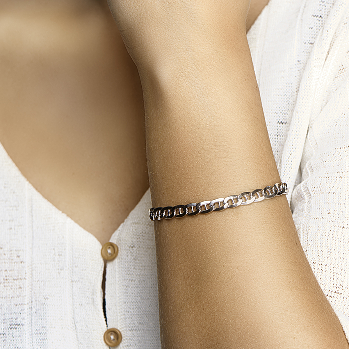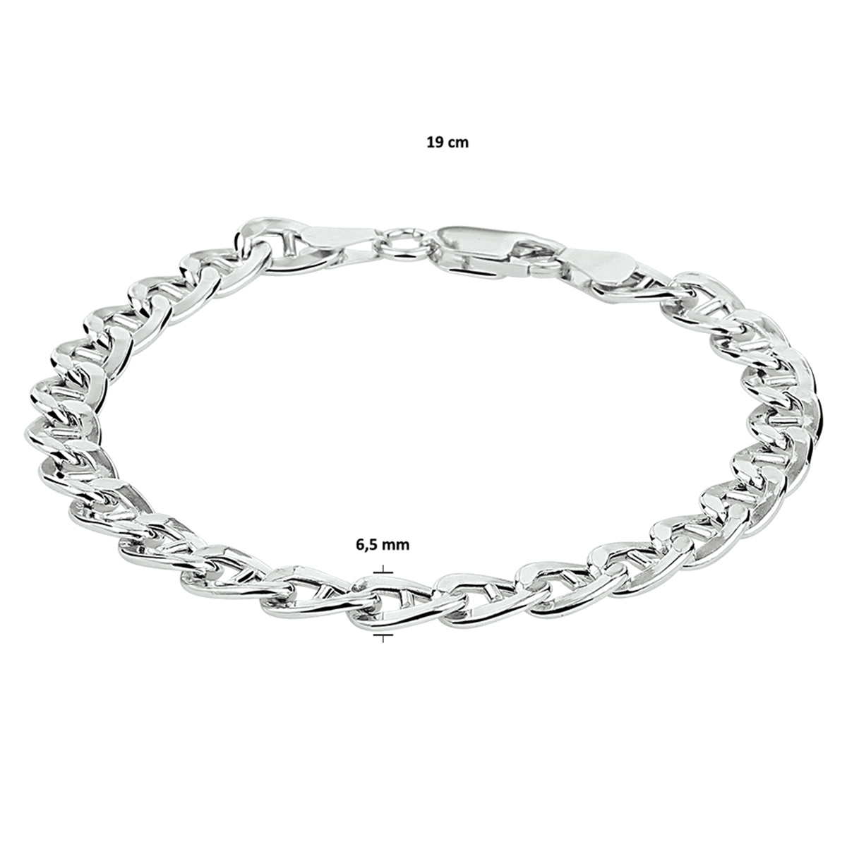 De armband is gemaakt van gerhodineerd zilver en is zilverkleurig. Het is een sieraad voor dames.