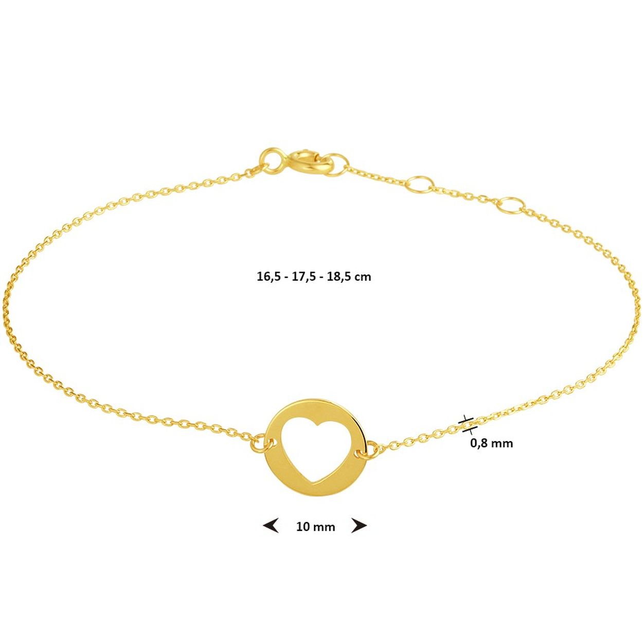 14k Geelgouden armband uitgevoerd met een rondje met daarin een open hartje. De armband heeft draaglengtes van 16.5, 17.5 en 18.5cm. Het rondje heeft een diameter van 10mm.