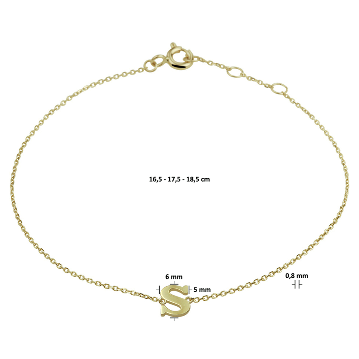 14k Geelgouden anker armband uitgevoerd met de letter S. De armband heeft draaglengtes van 16.5, 17.5 en 18.5cm. De letter heeft een afmeting van 6x5mm.