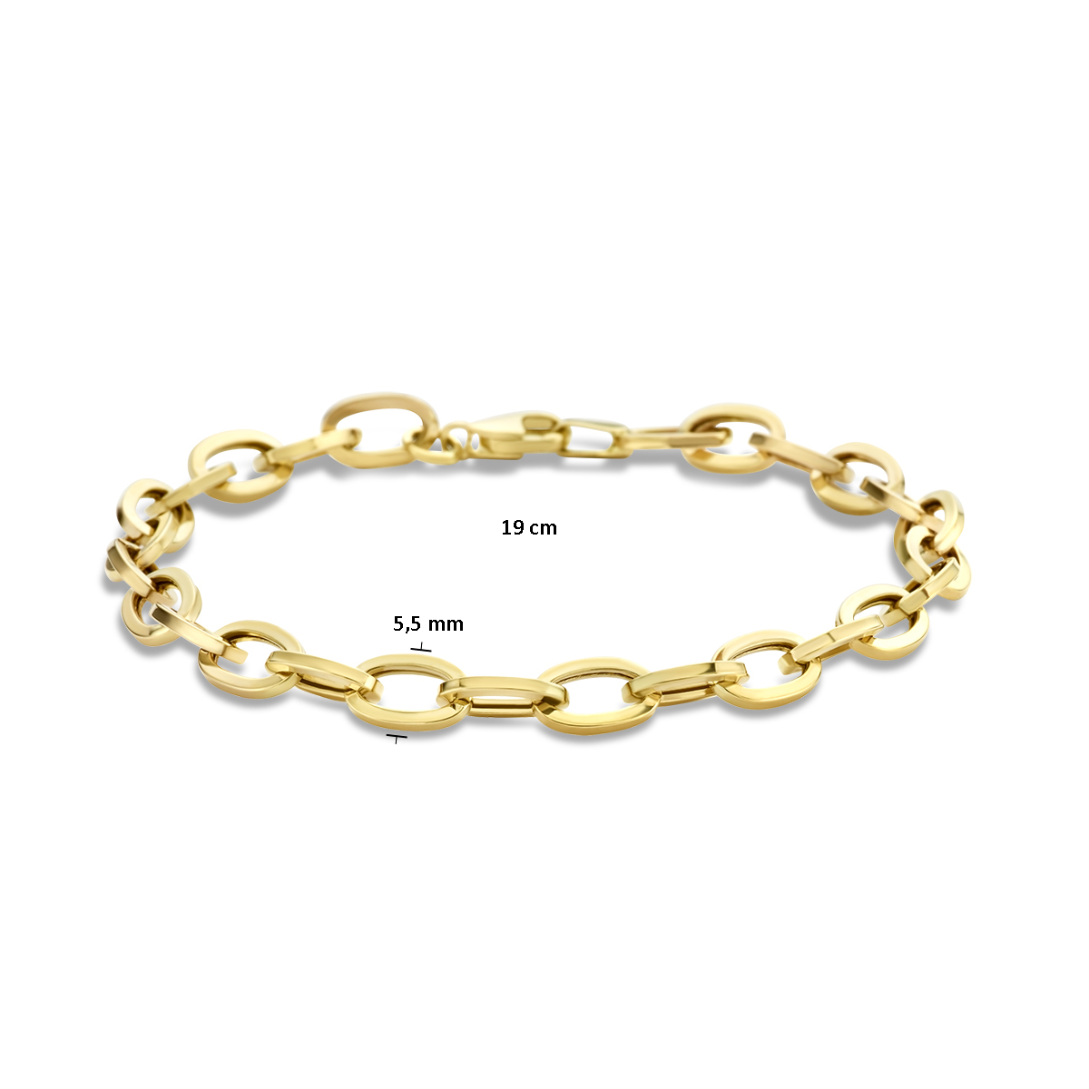 14k Geelgouden armband met een schakelbreedte van 5.5mm en een draaglengte van 19cm. Uitgevoerd met karabijnsluiting.