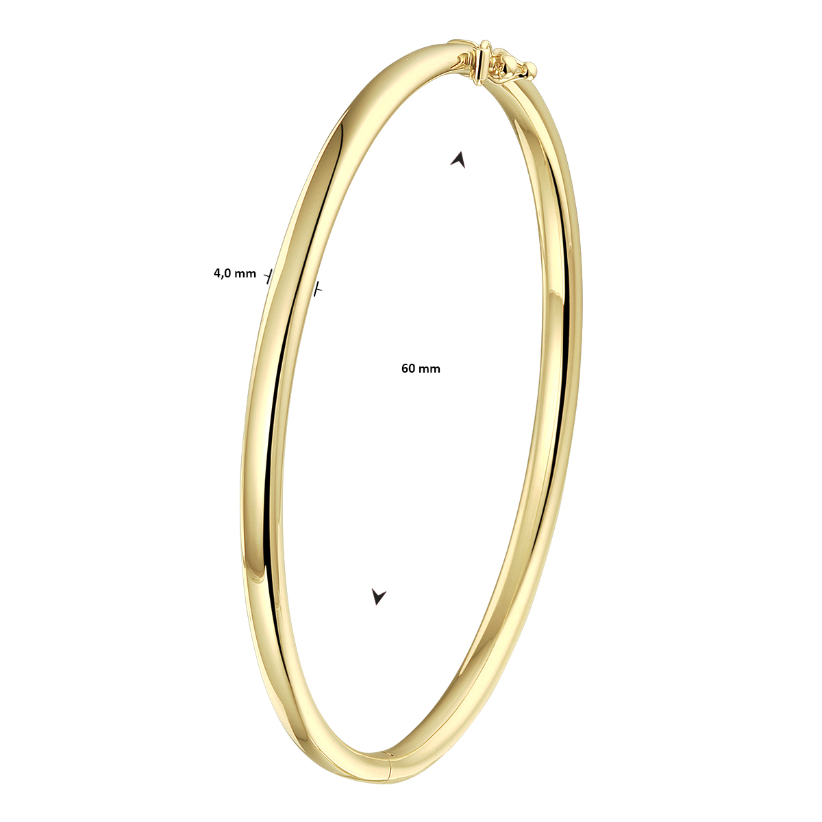 14k Geelgouden bangle uitgevoerd met scharnier. De bangle heeft een breedte van 4mm.