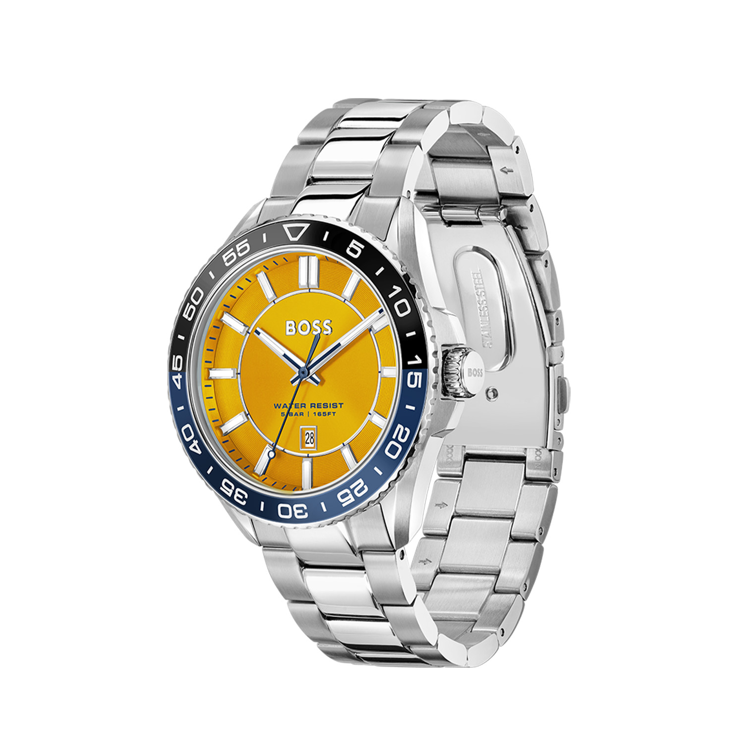 Dit BOSS horloge uit de RUNNER 3H serie met artikelnr: HB1514206 heeft een stoere sportieve uitstraling. Zeer geschikt voor de moderne stijlvolle man van nu. Het herenhorloge valt op door zijn stalen horlogekast met een gekleurde bedrukte bezel en een geeloranje sunray wijzerplaat met een datum. Opvallend zijn de wijzers en uurstrepen die met lumibrite zijn ingelegd. Aan de kast zit een stalen mat glanzende schakelband met een vouwsluiting. Het horloge heeft een doorsnee van 43mm met een mineraalglas en is 5ATM.