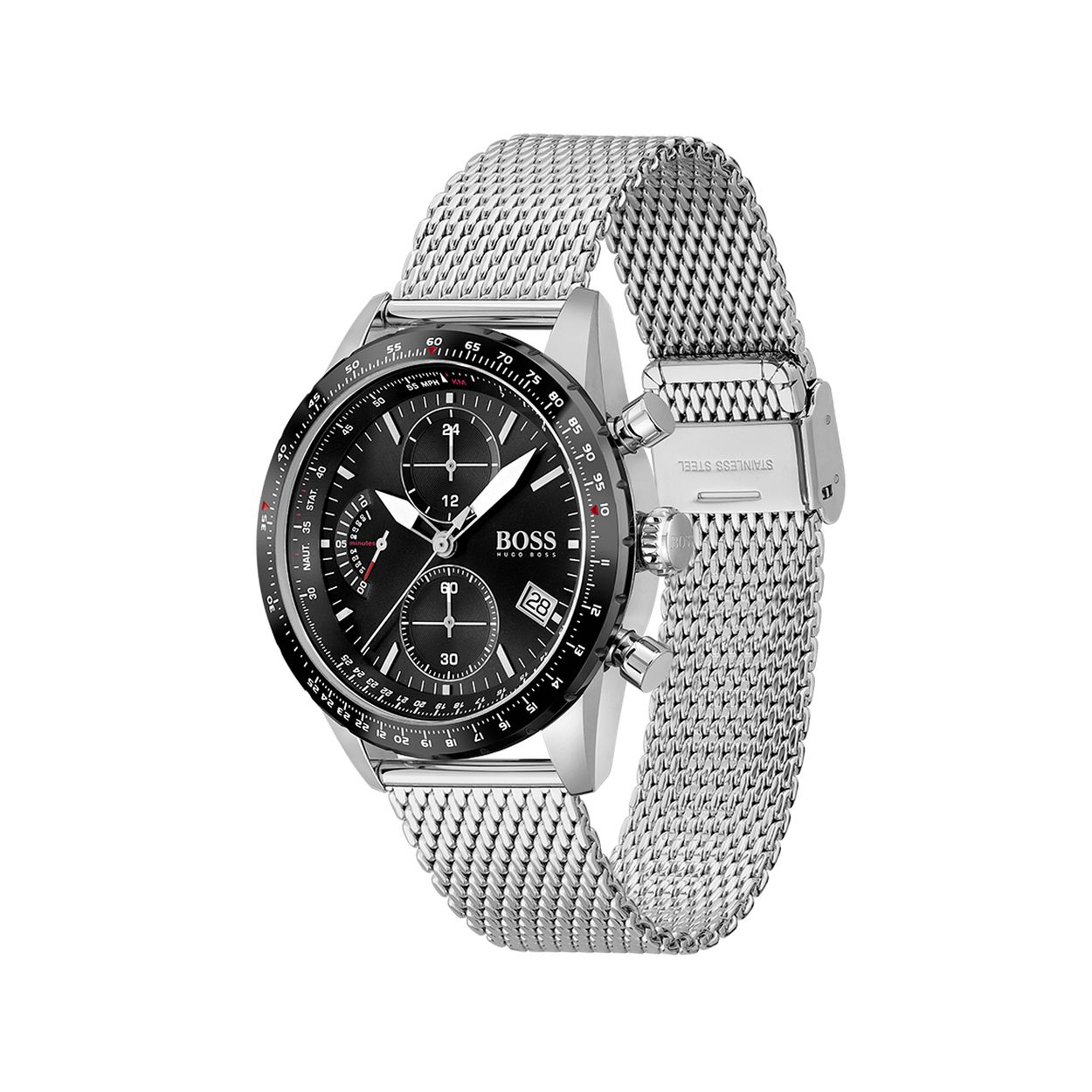 Dit BOSS horloge uit de Pilot Edition Chrono serie met artikelnr. HB1513886 heeft een spectaculaire uitstraling. Het specifieke herenhorloge is voor de liefhebber en is op de luchtvaart gebasserd. Het pilot herenhorloge heeft een zilverkleurige stalen horlogekast met een zwarte wijzerplaat met chronograaf en datumaanduiding en een zwarte bezel met diverse aanduidingen op de binnen en buitenrand zoals o.a een hoogtemeter. Het horloge heeft een doorsnee van 44mm met een mineraalglas en een zilverkleurige stalen milaneseband met klepsluiting en is 5 ATM.