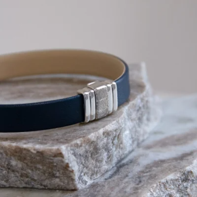 Zilveren armband met lederen bandje. Bovenop het zilveren stuk kan een gravuren geplaatst worden. In het slot is het mogelijk om as te verwerken. De lederen band is verkrijgbaar in diverse kleuren en wordt voor u op de juiste polsmaat gemaakt.