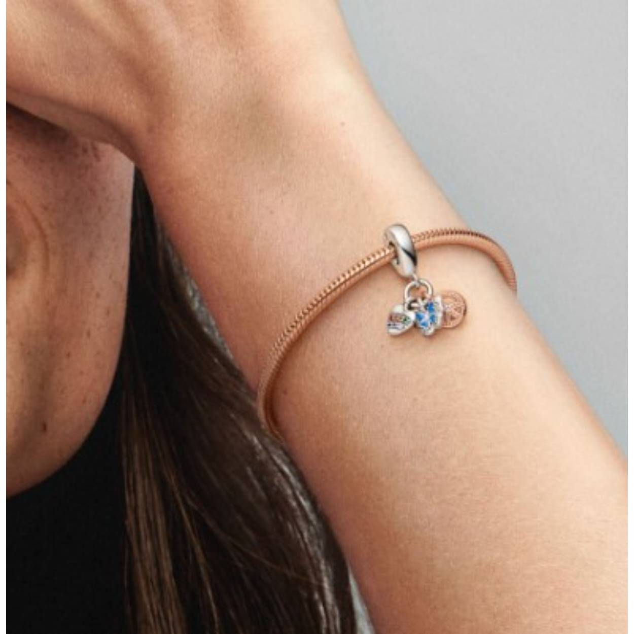 Geef je styling extra betekenis met onze tweekleurige regenboog hart, vlinder en vredesteken driedubbele hangende bedel. Deze driedubbele hangende bedel is uitgevoerd met een sterlingzilveren hart dat is bezet met twee rijen regenboogpavé en op de achterkant is gegraveerd met de inscriptie 'L<3ve', een sterlingzilver vlinder met geschakeerd blauw emaille dat met de hand is aangebracht en op de achterkant is gegraveerd met de inscriptie 'Freedom', en een vredesteken dat is verguld met 14-karaat roségoud en is afgewerkt met microbeads en een steen in het midden en de inscriptie 'Peace' op de achterkant. Draag als dagelijkse herinnering aan je waarden.
