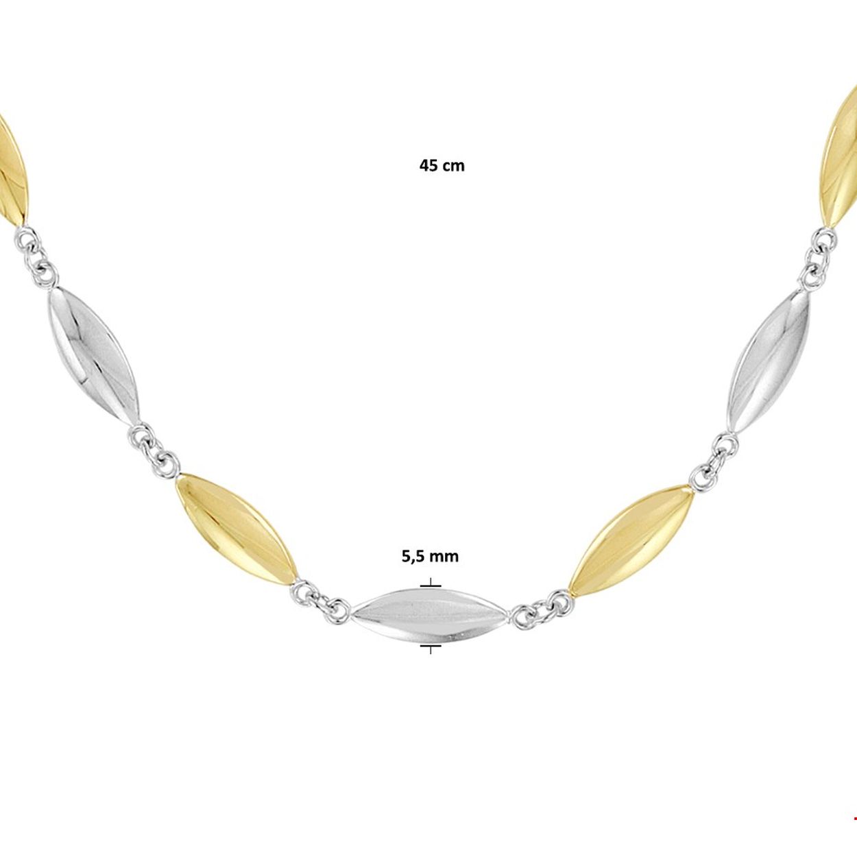 Bicolor wit- en geelgouden collier met een draaglengte van 45cm. Het collier heeft een poli afwerking en is uitgevoerd met een stevige karabijn sluiting. Glam up your outfit! Dit collier geeft je look direct een chique uitstraling.