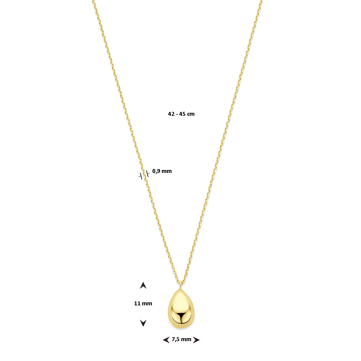 14k Geelgouden collier uitgevoerd met een druppel. Het collier heeft draaglengtes van 42-45cm.
