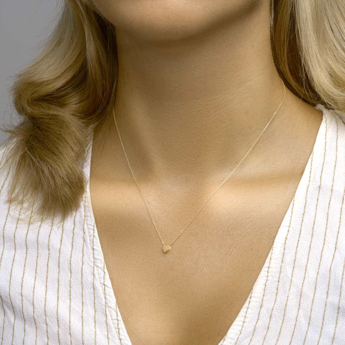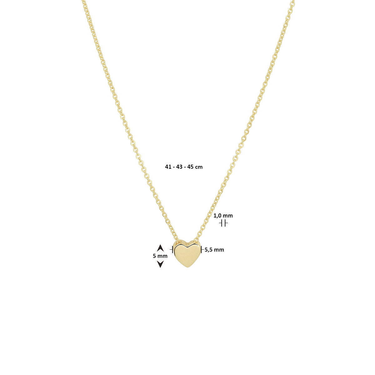 14k Geelgouden collier uitgevoerd met een hartje. Het collier heeft draaglengtes van 41, 43 en 45cm. Het hartje heeft een afmeting van 5x5.5mm.