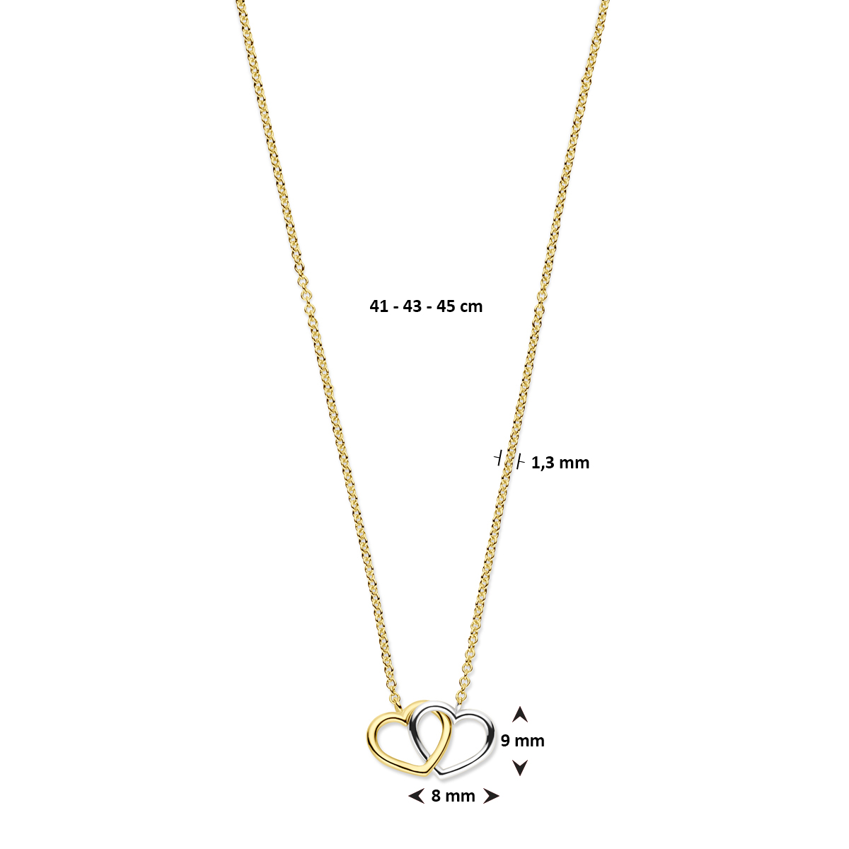 Beschrijving: Trendy geelgouden 1.3mm anker collier met draaglengtes van 40 42 en 44 cm twee poli afgewerkte hartjes van 9x8mm. Tip: Combineer dit trendy collier met een van onze bijpassende sieraden uit onze collectie en maak zo een hippe set.