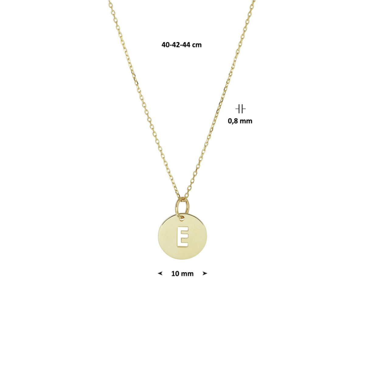 14k Geelgouden anker collier uitgevoerd met een ronde letter E hanger. De hanger heeft een diameter van 10 mm en het collier heeft draaglengtes van 40 42 en 44cm. Tip: Geef dit betekenisvolle collier cadeau aan een speciaal persoon.