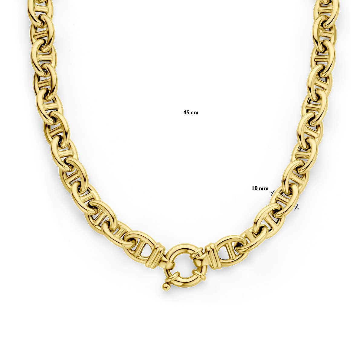 14k Geelgouden collier. Het collier heeft een draaglengte 45 cm. De schakelbreedte is 10mm. Uitgevoerd met een groot veerslot.