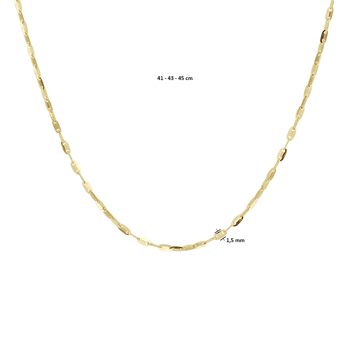 14k Geelgouden collier met een schakelbreedte van 1.5mm. Het collier heeft draaglengtes van 41, 43 en 45cm.