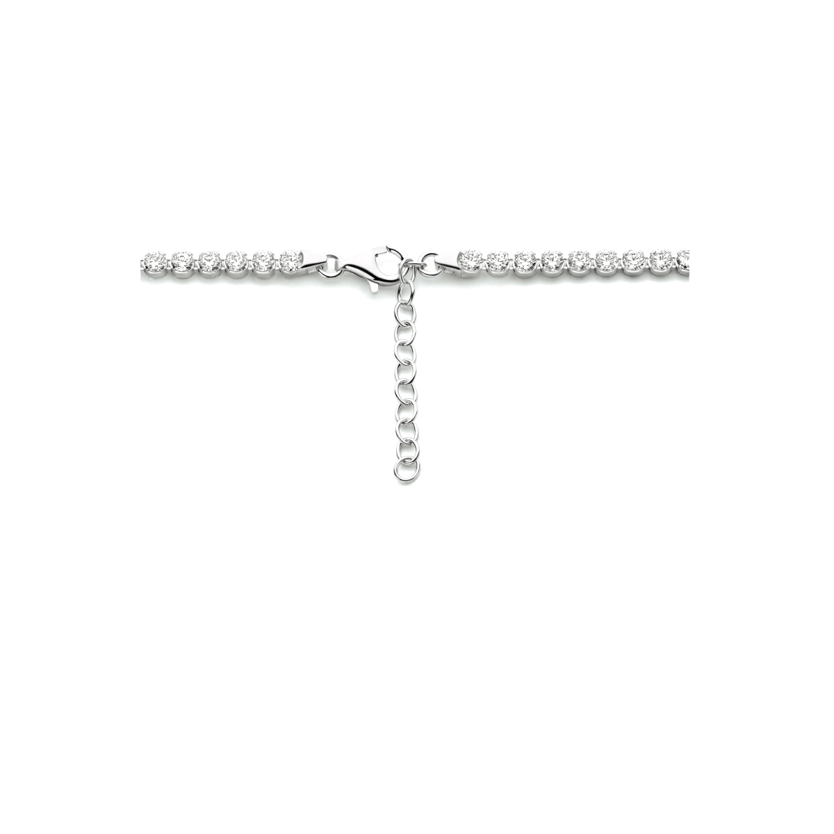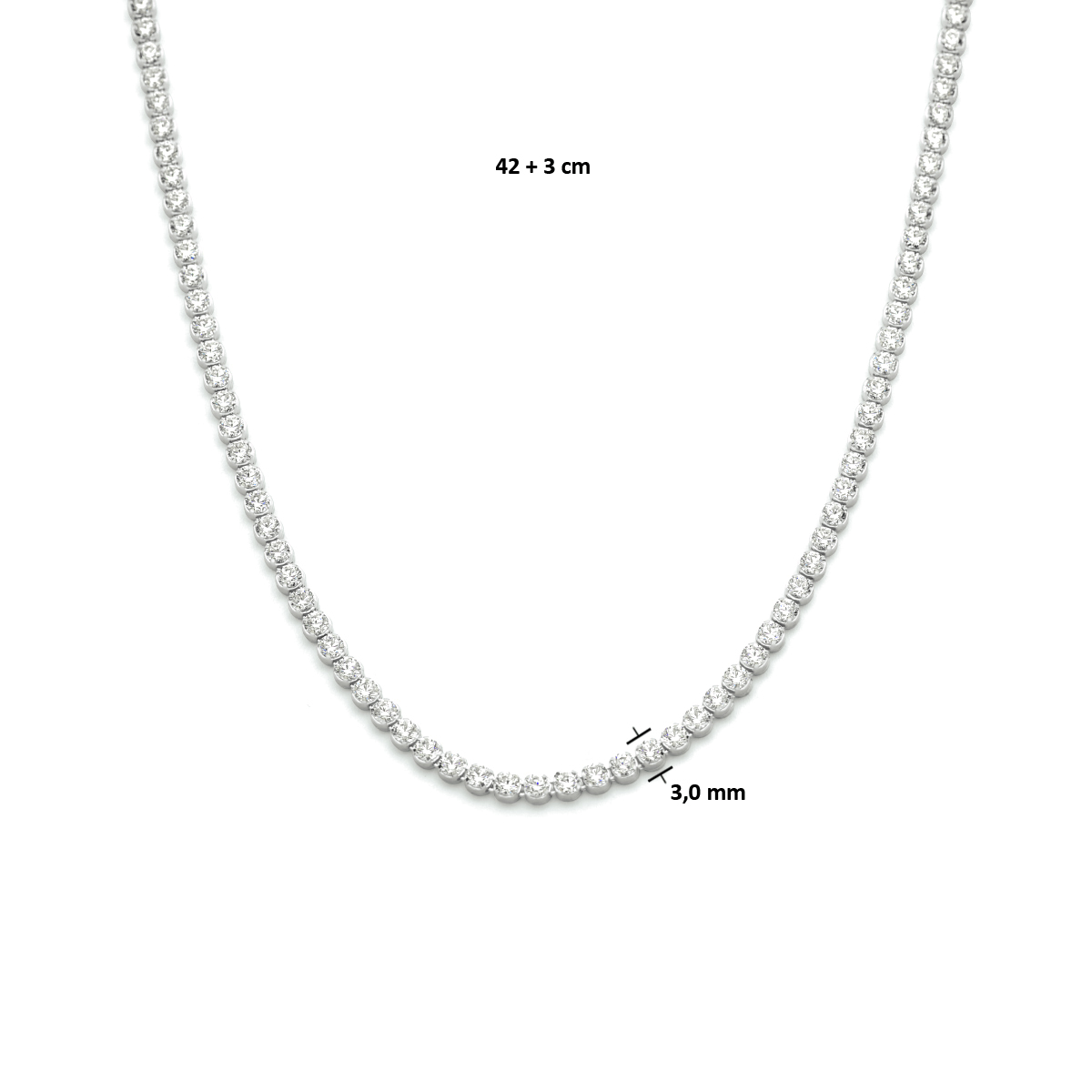 Gerhodineerd 925 zilveren collier uitgevoerd met een schitterende zirkonia rij en een stevige karabijn sluiting. Het collier heeft een breedte van 3mm en een draaglengte van 42cm met een extensie van 3cm.
