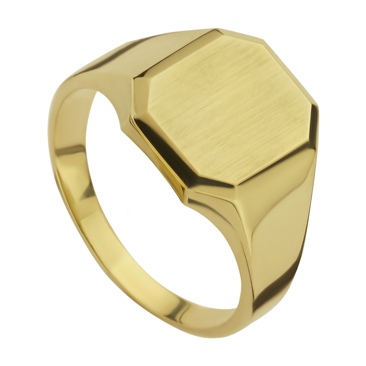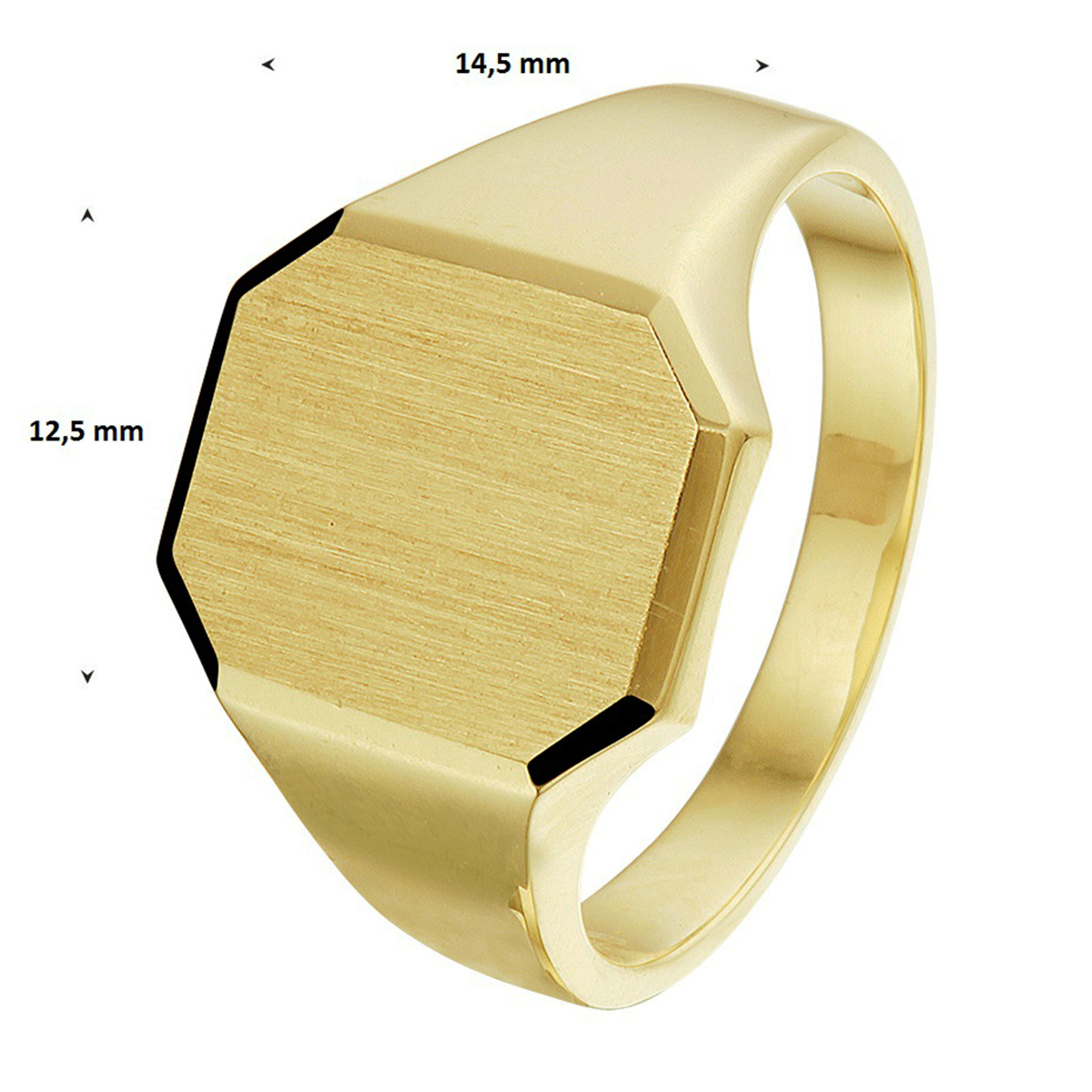 Stijlvol geelgouden mat gediamanteerde graveerring met een afmeting van 14.5x12.5mm. De gediamanteerde afwerking en de robuuste afkanteningen van de ring maken dit sieraad helemaal af.