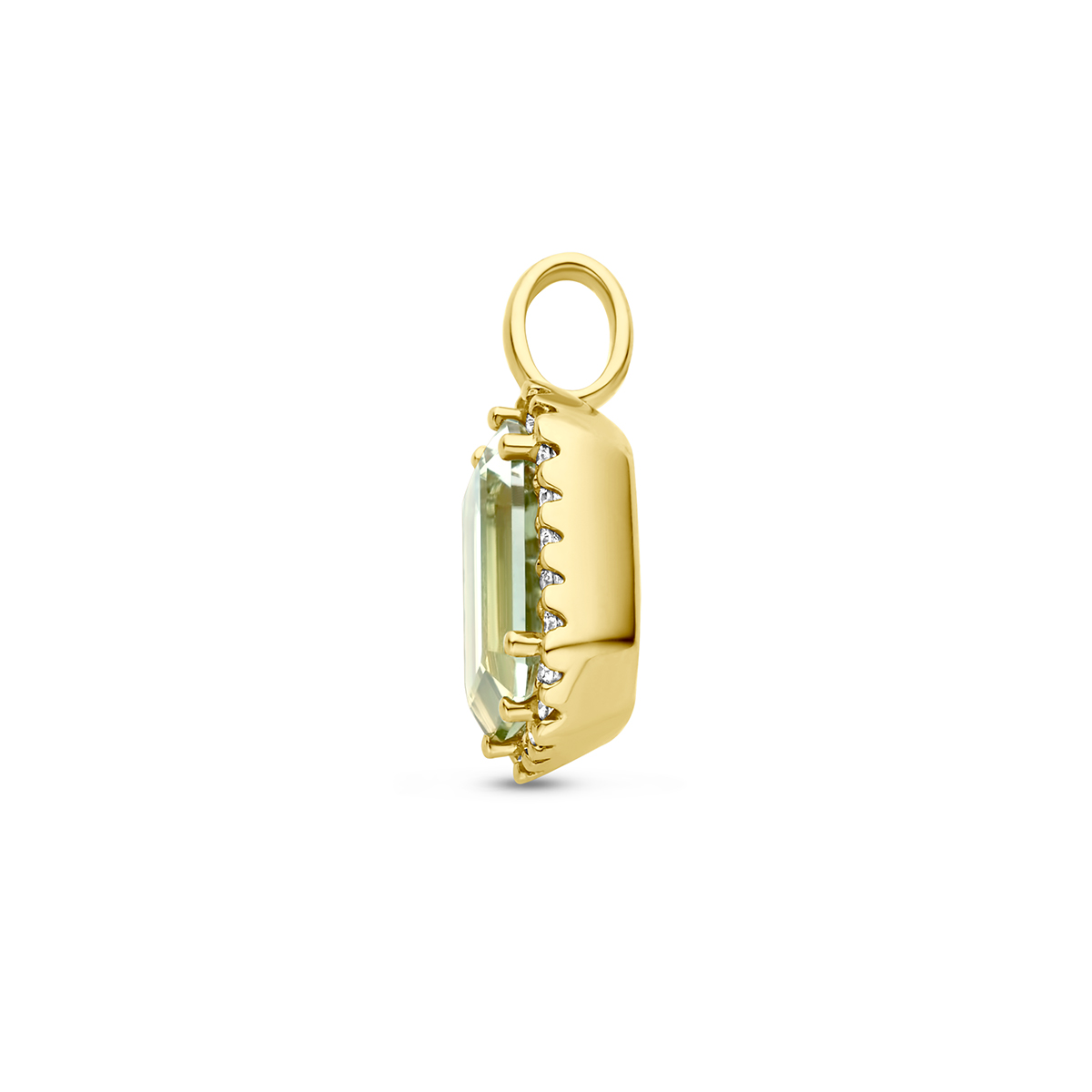 14k Geelgouden hanger uitgevoerd met groen amethyst en diamanten. De groen amethyst heeft een steengewicht van 1.75ct.