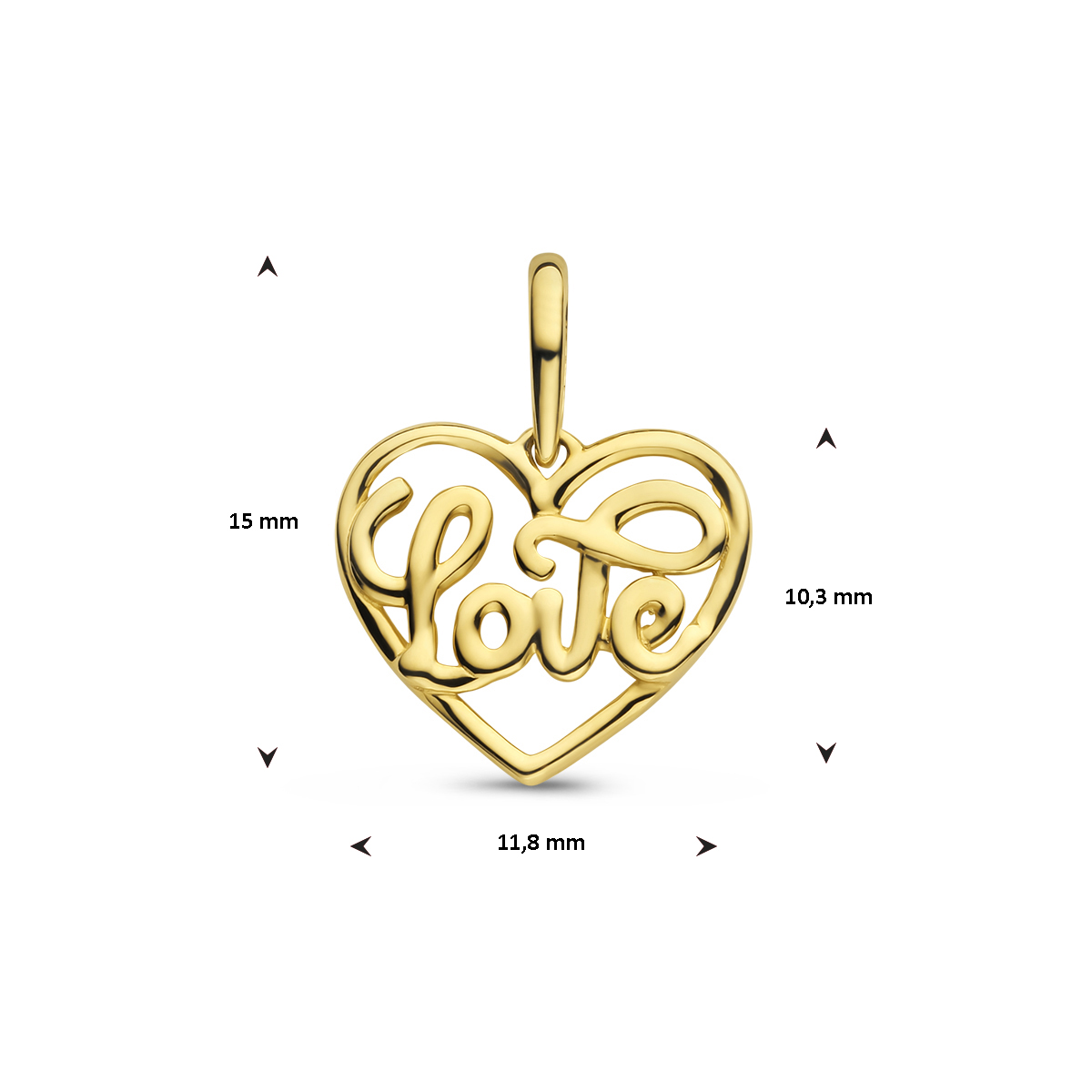 14k Geelgouden hartjes hanger met de tekst love. Het hart heeft een afmeting van 10.3x11.8mm.