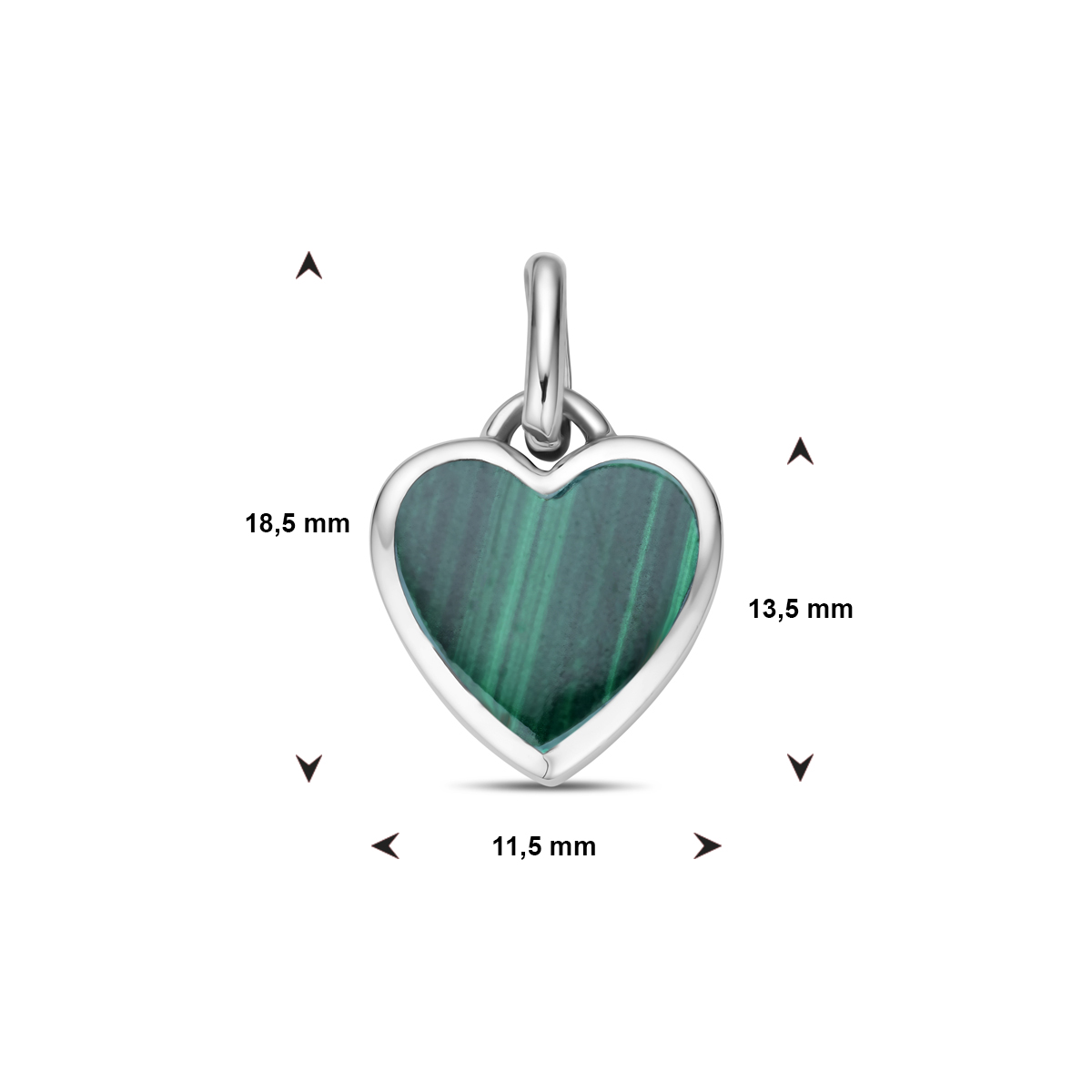Gerhodineerd 925 zilveren hanger uitgevoerd in de vorm van een hartje met malachiet. De hanger heeft een afmeting van 18.5x11.5mm.