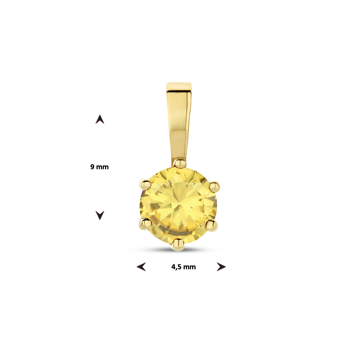 14k Geelgouden geboortesteen hanger uitgevoerd met een schitterende geel zirkonia. De hanger heeft een afmeting van 9x4.5mm.