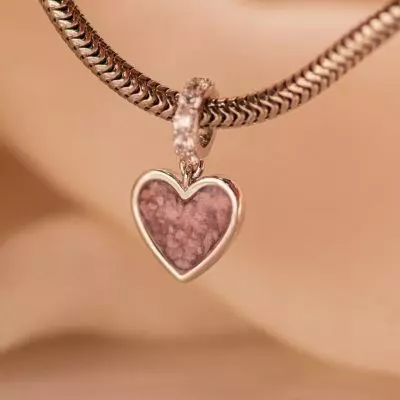 Hart bedel met zirkonia/diamant hangoog. De bedel wordt aan de voorkant gevuld met as, moedermelk of haar. De bedel is geschikt om aan armbanden 811 S, 812 S of 813 S gedragen te worden. Tevens geschikt om aan een Pandora armband te dragen. Op de achterzijde is nog plek voor een gravure zoals bijvoorbeeld een naam, datum of vingerafdruk.