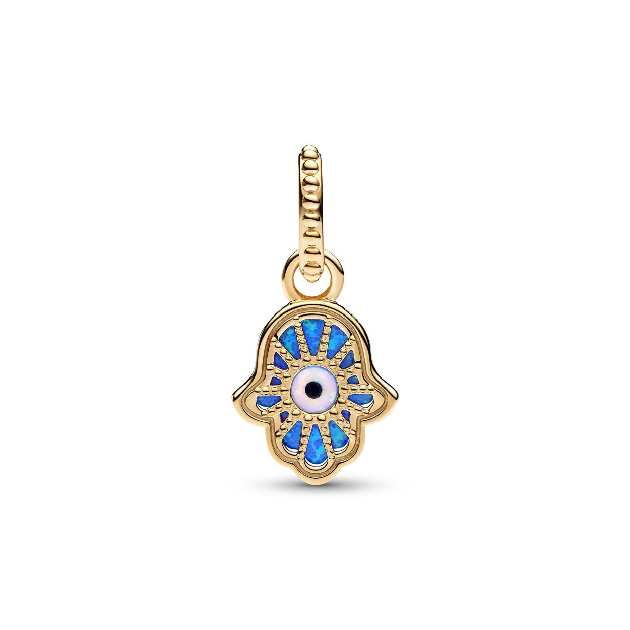 Oud symbool, nieuwe vibe. Draag de Opalescent Blauwe Hamsa Hand Hangende Bedel als bescherming en omring jezelf met positieve energie. Deze met 14k goud vergulde Hamsa-bedel toont een glinsterende diepblauwe in het laboratorium gemaakte opaal. Aan de ene kant straal een opengewerkt zonnestraalontwerp vanuit een alziend oogmotief in het midden met ee witte in het laboratorium gemaakte opaal. De Hamsa is van oorsprong een talisman om je te beschermen tegen het kwaad en is een gebaar van het verwelkomen van goedheid, vriendelijkheid, vriendschap en gratie in je leven.