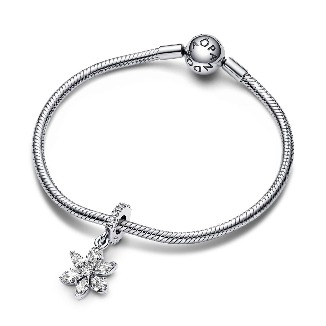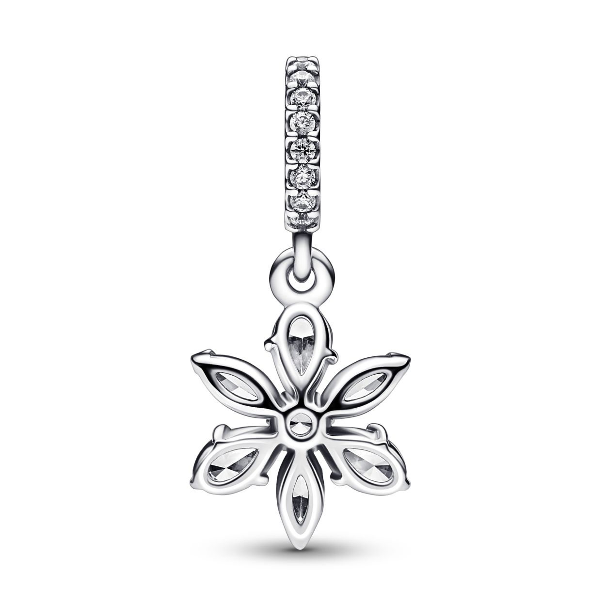 Breng de schoonheid van de natuur in je sieraden met de Sparkling Herbarium Cluster Dangle Charm. Deze sterlingzilver hangende bedel bestaat uit een cluster van afwisselende peer- en marquise-vormige stenen rondom een ronde centrale steen die een geometrische vorm creëren, geïnspireerd op de elementen van bloemblaadjes en bladeren. Een elegante herinterpretatie van de vormen die we in de natuur vinden. Hij geeft je dagelijkse look een delicate, zwevende uitstraling.