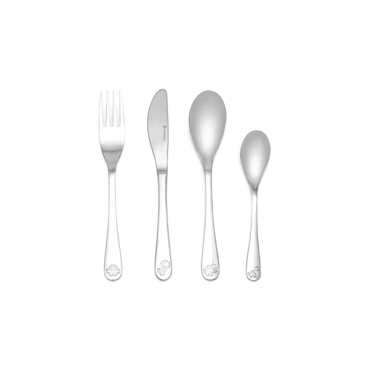Bij Sluis Juwelier hebben we een kinderbestek van hoogwaardig 18/10 RVS met afbeeldingen van dinosaurussen. De set is vaatwasmachinebestendig en bestaat uit een vork, mes, lepel en paplepeltje. De eerste hapjes waren nog nooit zo leuk!