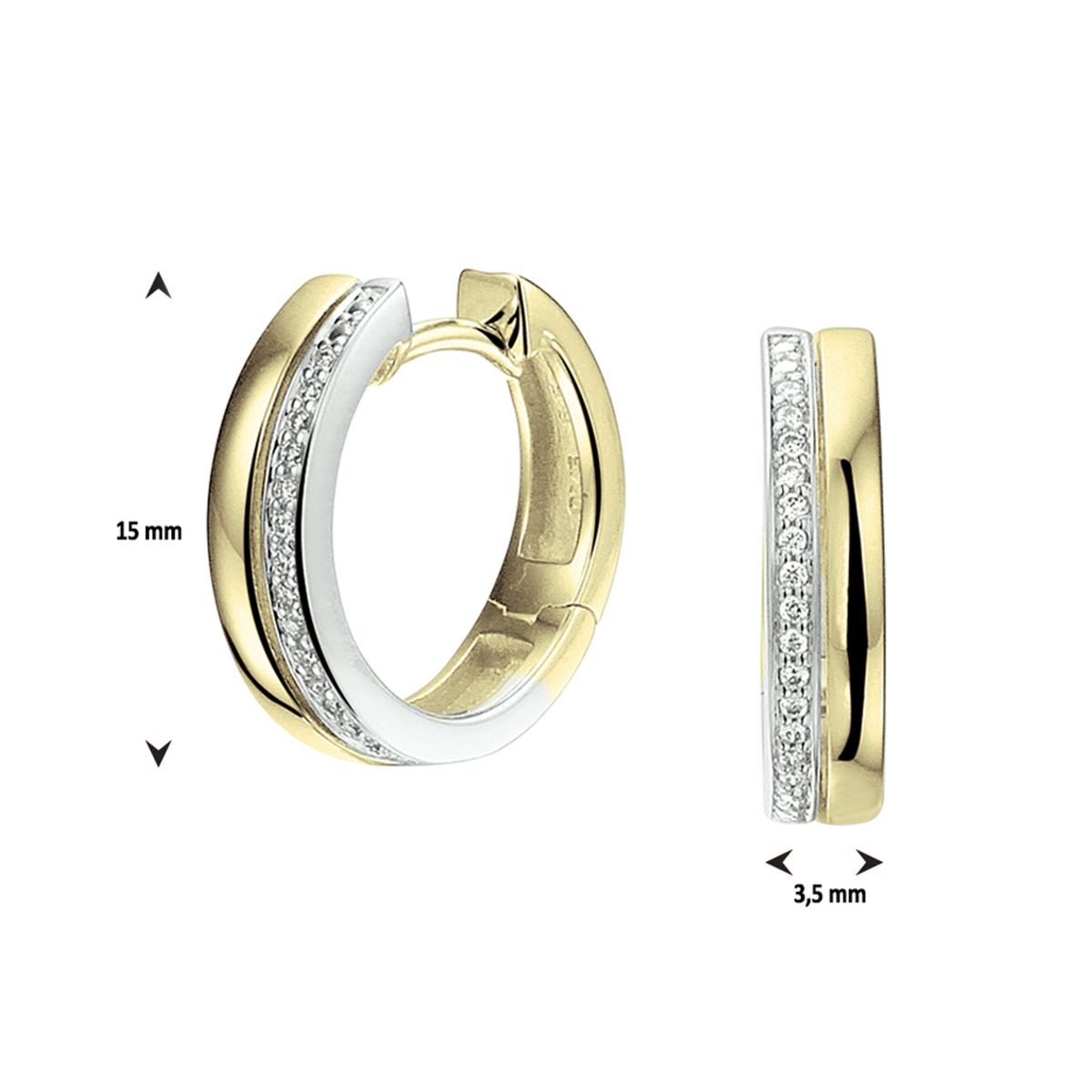 Beschrijving: Bicolor wit- en geelgouden klapcreolen met een schitterende diamant rij en een poli afwerking. Tip: Leuk om kado te geven zie je ze al stralen!?