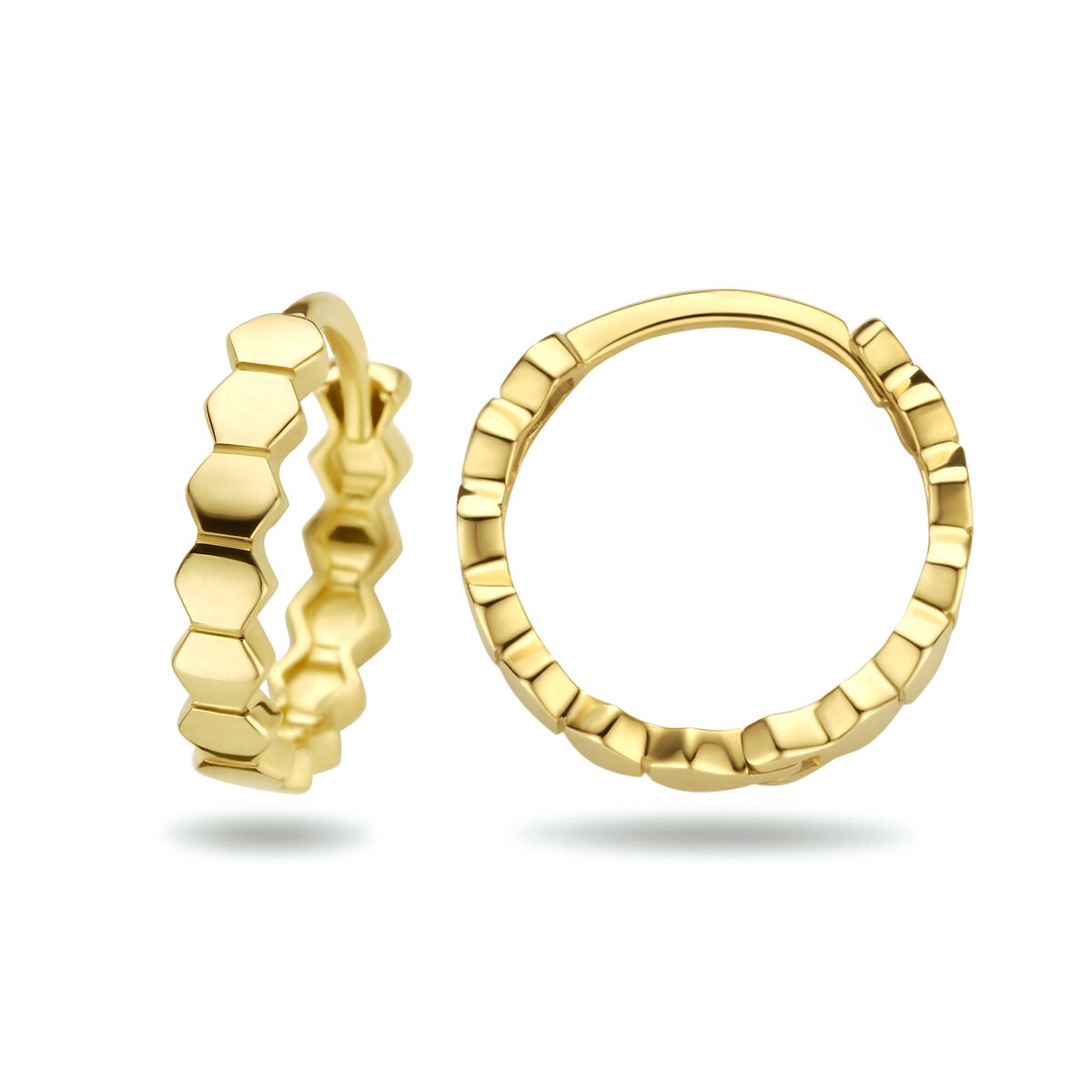 14k Geelgouden klapoorringen uitgevoerd met zeshoeken. De oorringen hebben een diameter van 12mm en een dikte van 2.5mm.