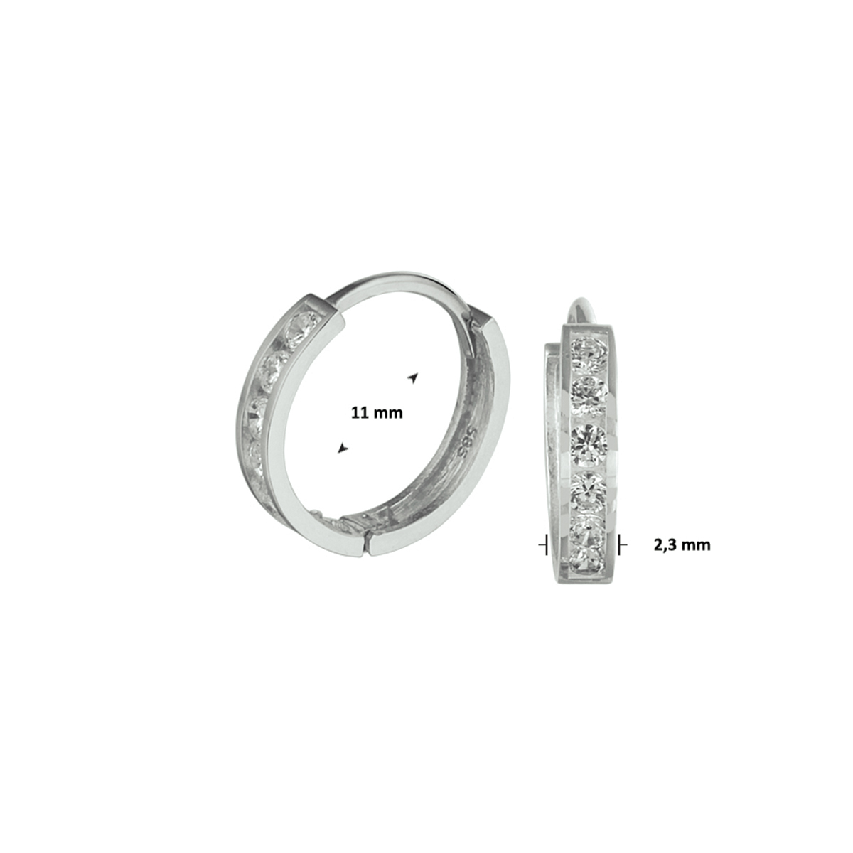 14k Witgouden oorringen met scharnier uitgevoerd met een zirkonia rij. De afmeting van de oorringen is 11x2.3mm.