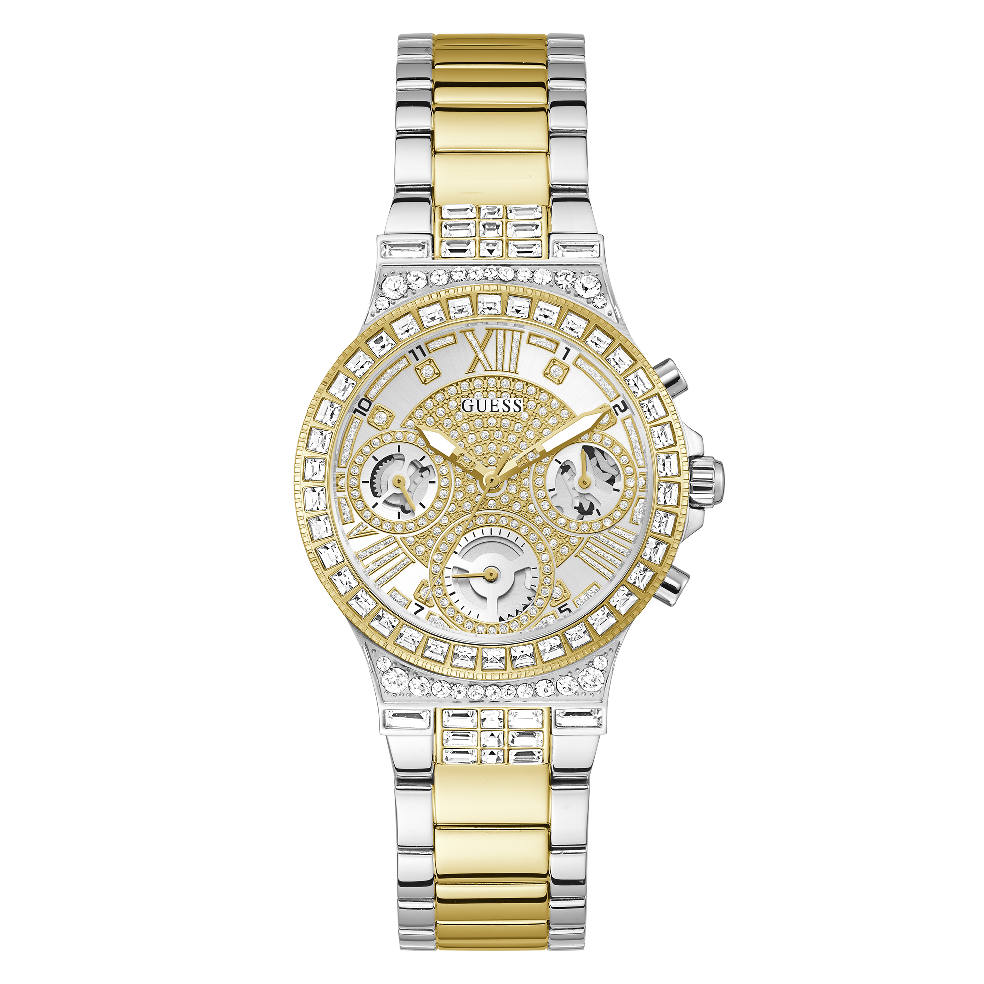 De bicolor versie van de besteller van Guess Watches, dit sprankelende model uit de Moonlight serie. Dit multifunction horloge leest naast de tijd ook dag, datum en 24 uurs aanduiding af. De diameter van de kast is 36 mm en de bicolor schakelband sluit middels een vouwsluiting.