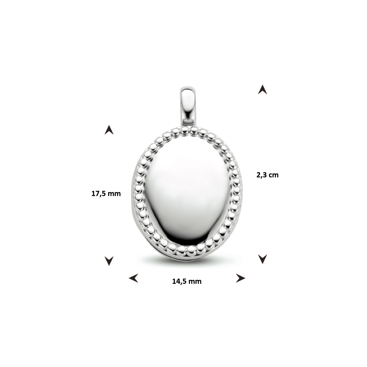 Gerhodineerd 925 zilveren medaillon uitgevoerd met bolletjes. De medaillon heeft een totale hoogte van 2.3cm en een breedte van 14.5mm.