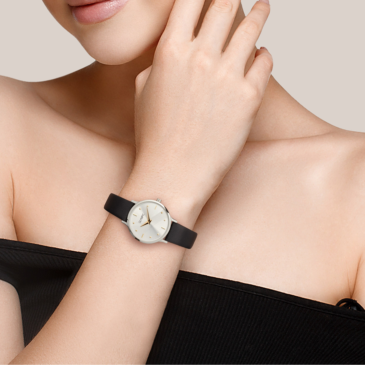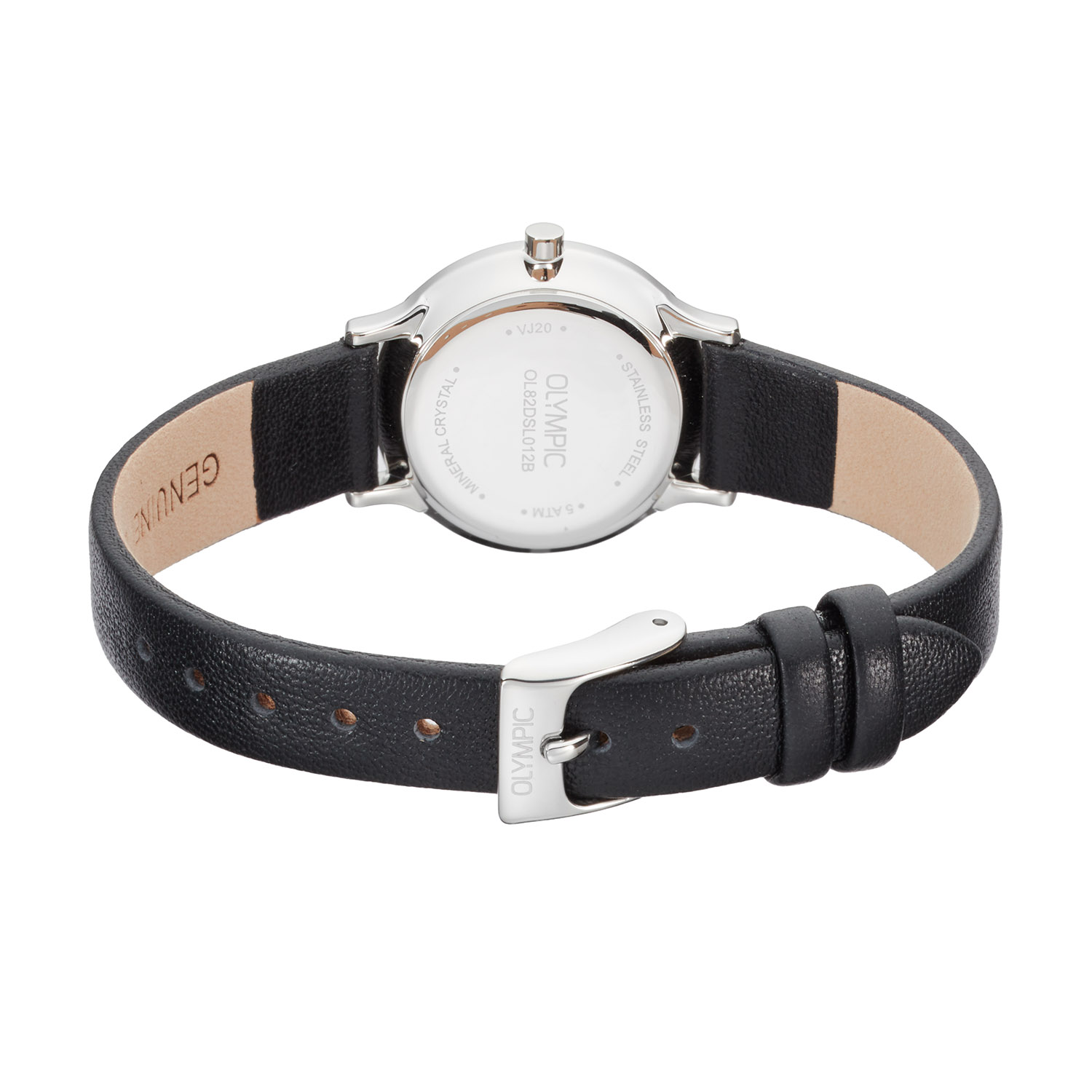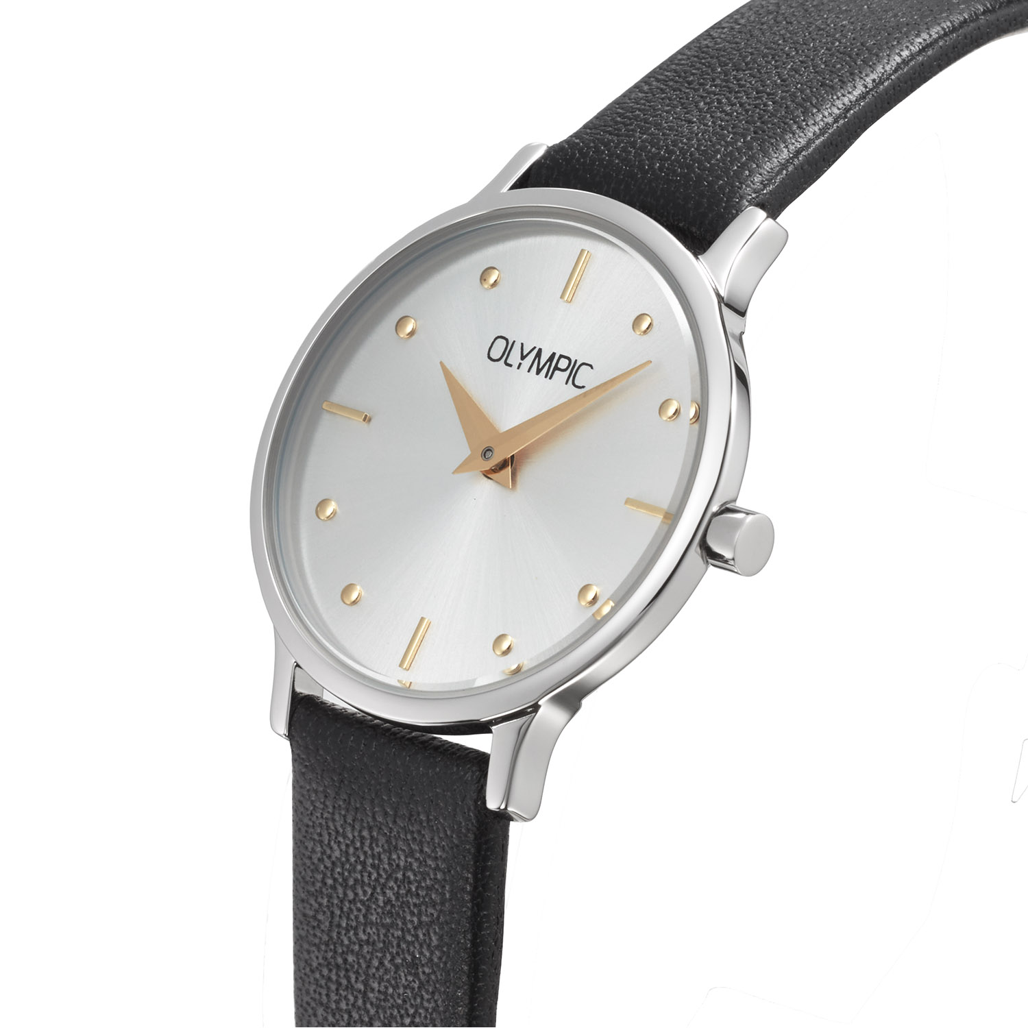 Dit unieke Olympic model met artikelnummer: OL82DSL012B is een net dameshorloge. Het horloge heeft een stalen ronde kast met een gladde bezel en een zilverkleurige wijzerplaat met goudkleurige strepen en stippen als uursaanduiding. Aan de kast zit een zwarte lerenband met een gespsluiting. Het horloge heeft een mineraalglas, een doorsnee van 26mm en is 5ATM.