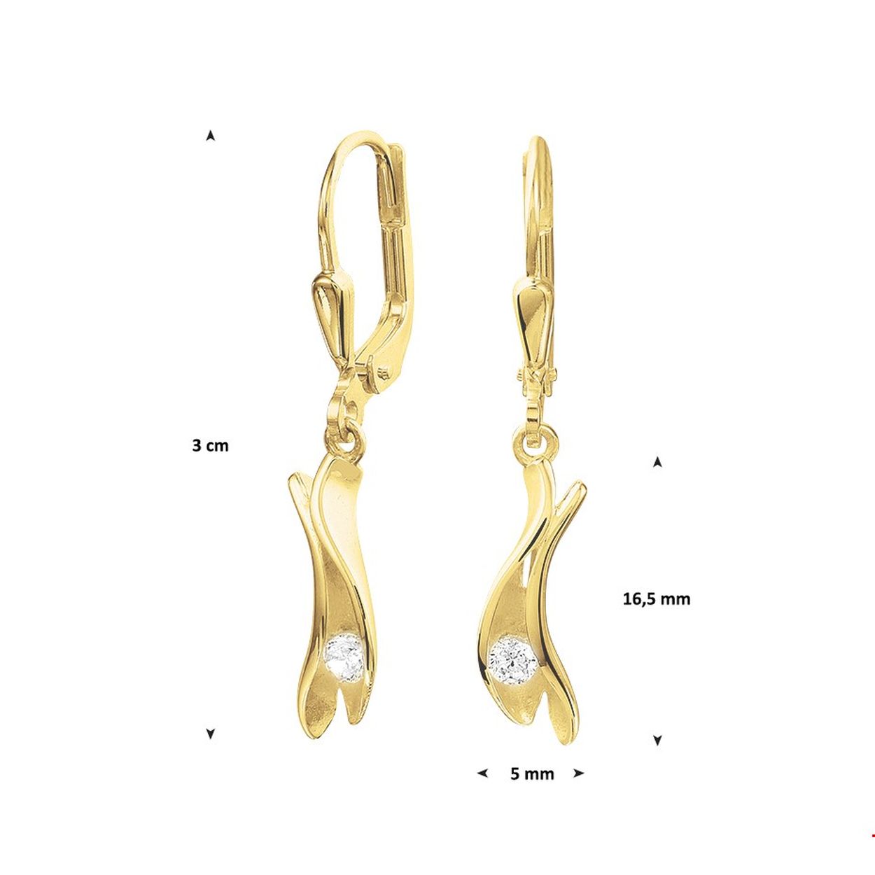 Beschrijving: Sierlijke geelgouden oorhangers met schitterende details zoals de sprankelende zirkonia steen en de poli/matte afwerking. De oorhangers hebben een totale hoogte van 3cm.