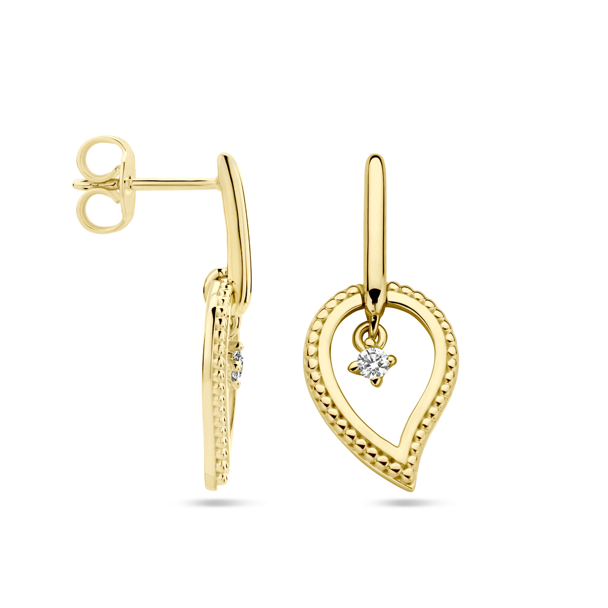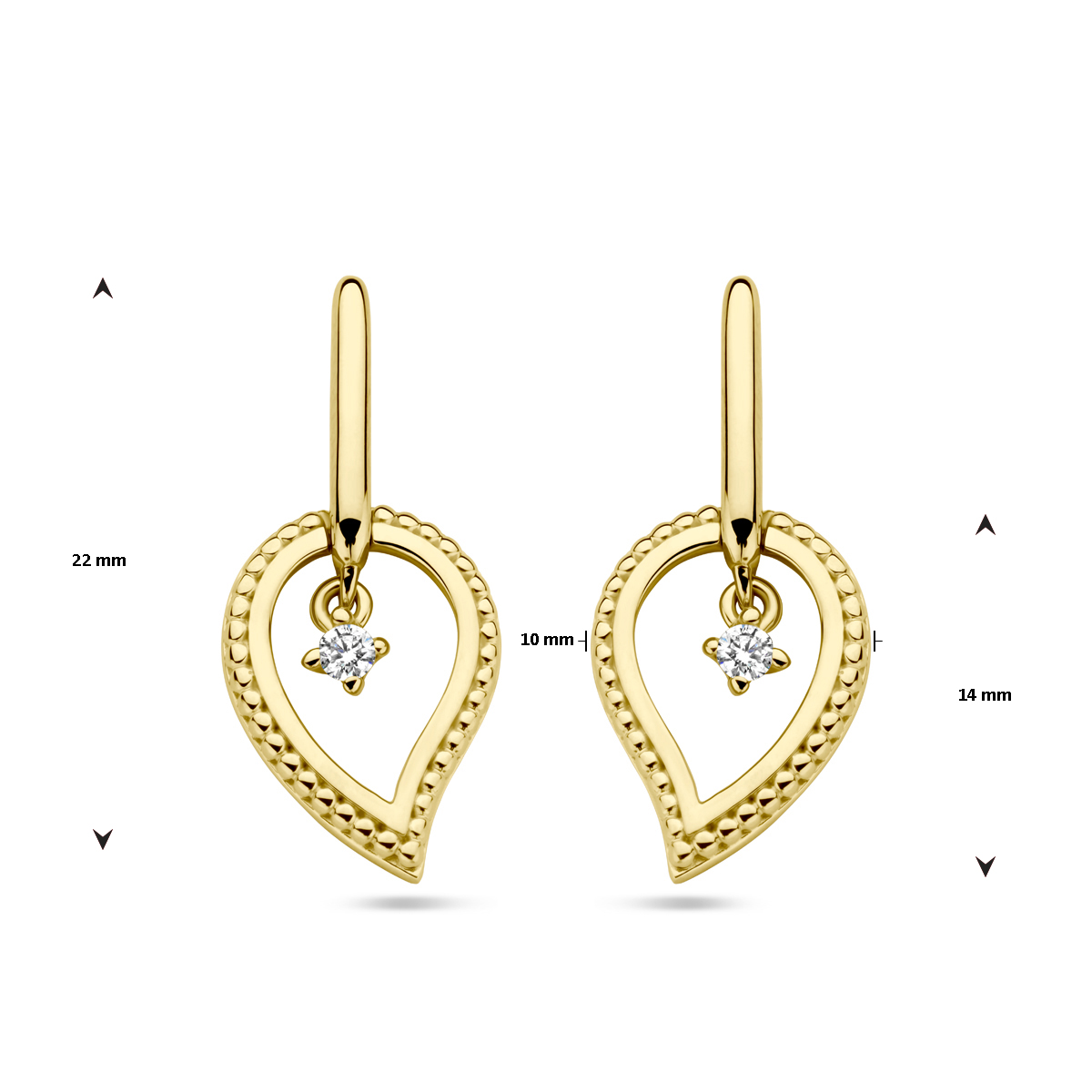 14k Geelgouden oorhangers uitgevoerd met diamant. De oorhangers hebben een totale hoogte van 22mm.