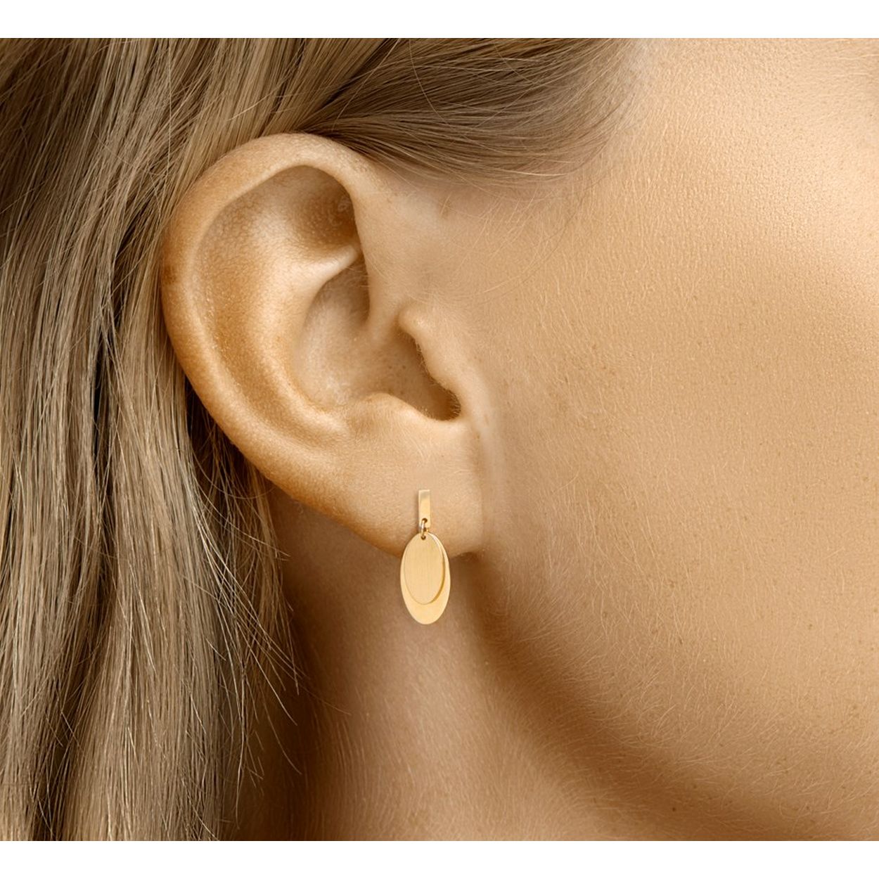 14k Geelgouden oorhangers uitgevoerd met een ovale hanger. De oorhangers hebben een totale hoogte van 2.2cm en een poli/matte afwerking. De hanger heeft een afmeting van 15x8.5mm.