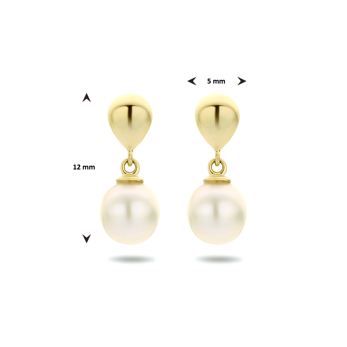 14k Geelgouden oorhangers uitgevoerd met een zoetwaterparel. De oorhangers hebben een totale hoogte van 1.2cm en een breedte van 5mm.