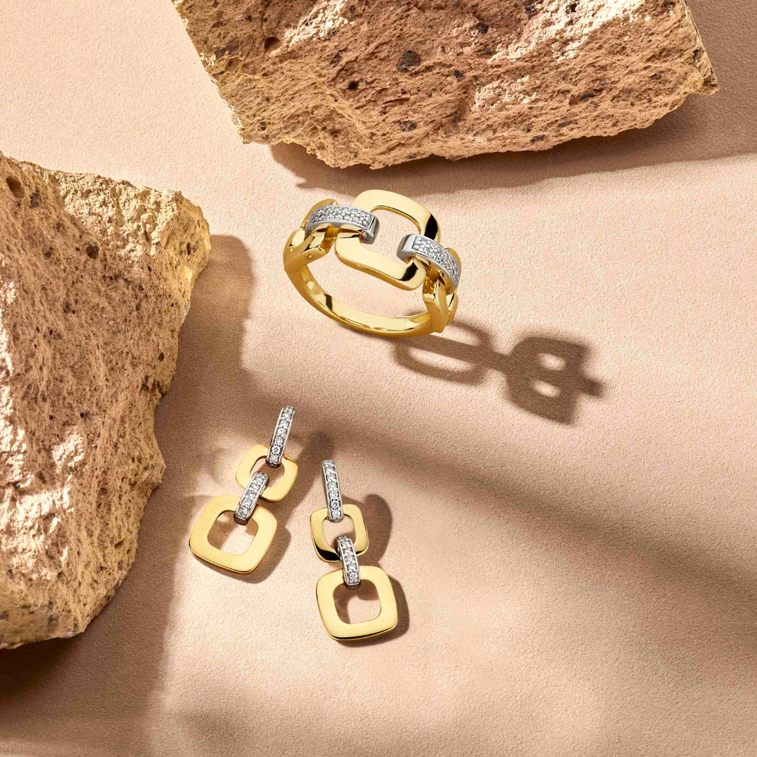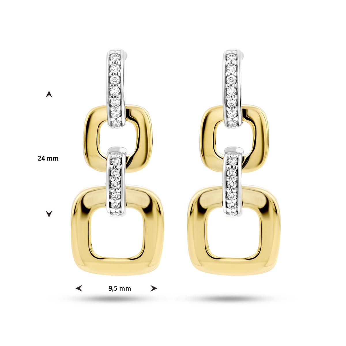 14k Bicolor geel- en witgouden oorhangers uitgevoerd met schitterend diamant. De oorhangers hebben een totale hoogte van 24mm. De totale diamantgewicht is 0.11ct (2x 0.055ct).