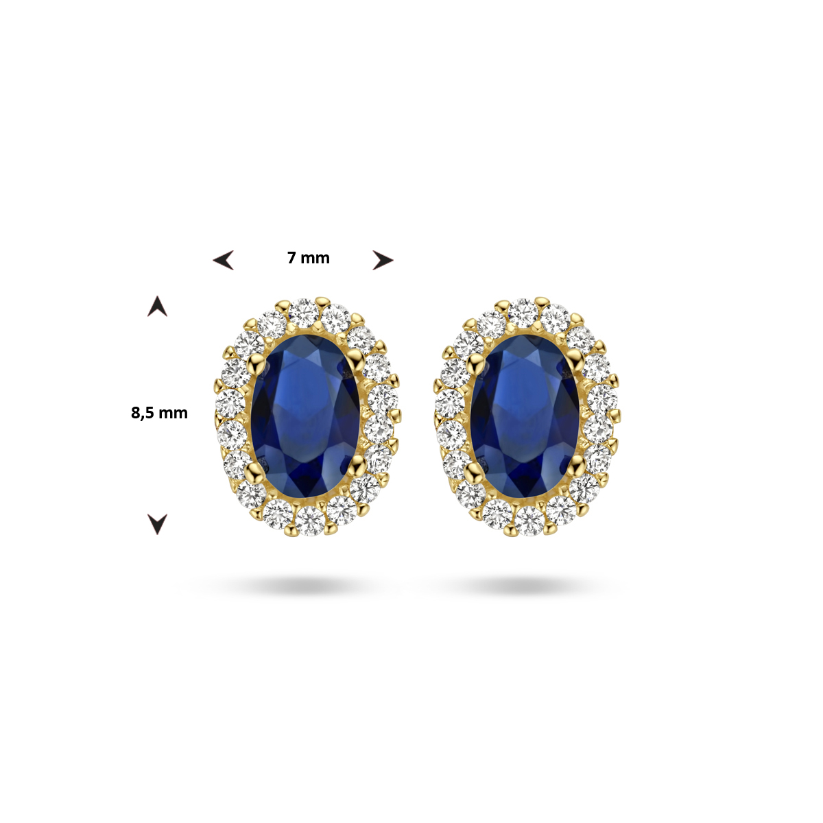 14k Geelgouden oorknoppen uitgevoerd met synthetische saffier. De oorknoppen hebben een afmeting van 8.5x7mm.