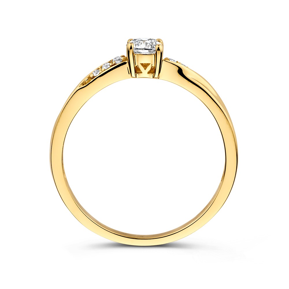 Geelgouden solitair met zirkonia's. De band heeft een speelse twist.