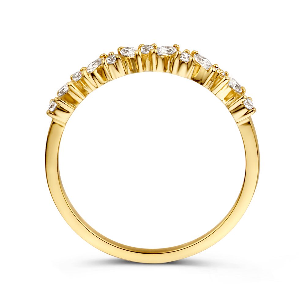 Geelgouden ring vol zirkonia's met opvallende fancy cut slijpsels (halfom gezet).