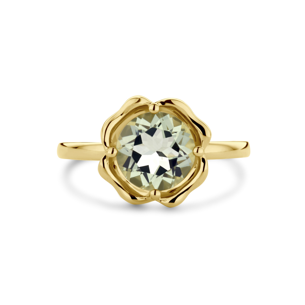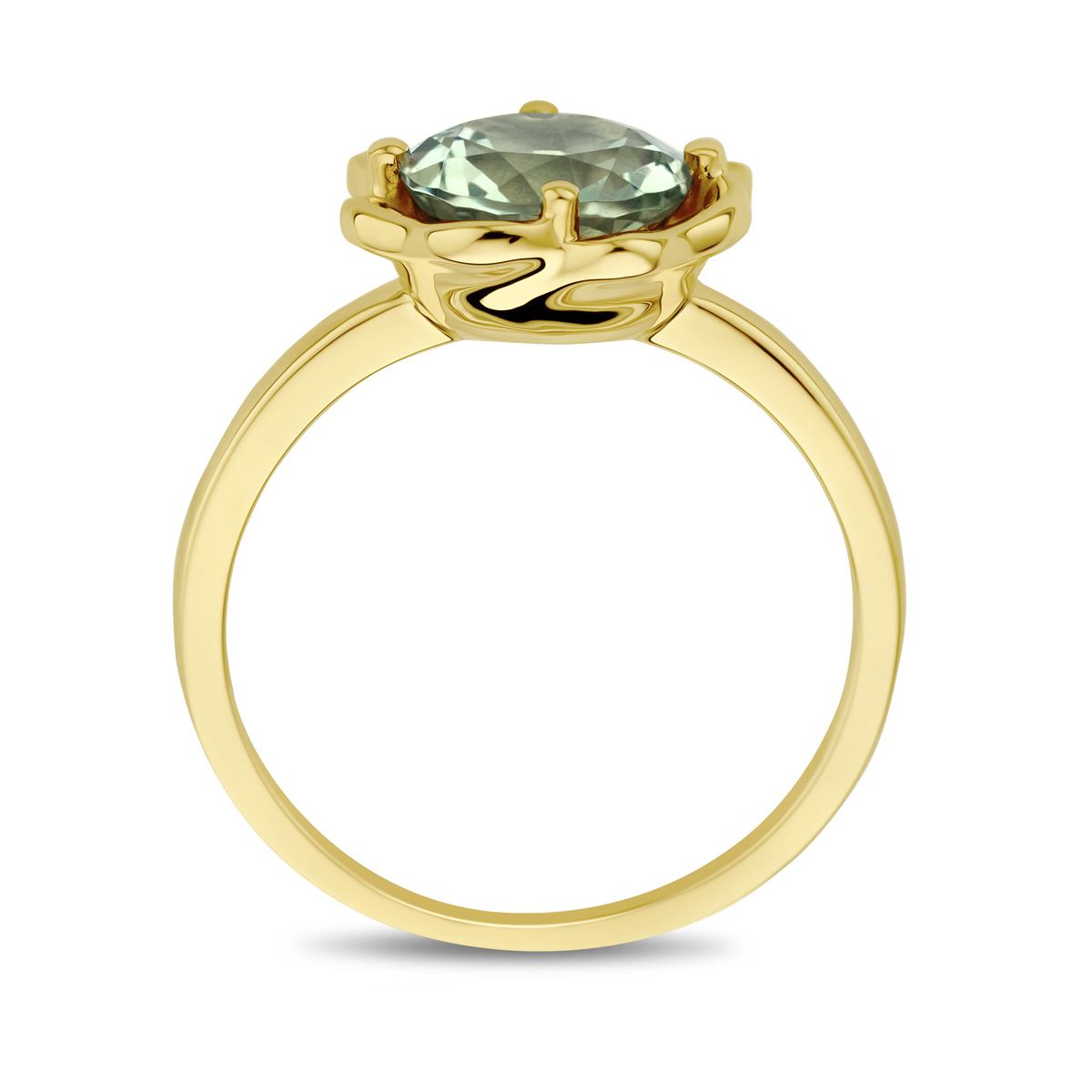 14k Geelgouden ring uitgevoerd met groen amethist. De steen heeft een diameter van 8mm.