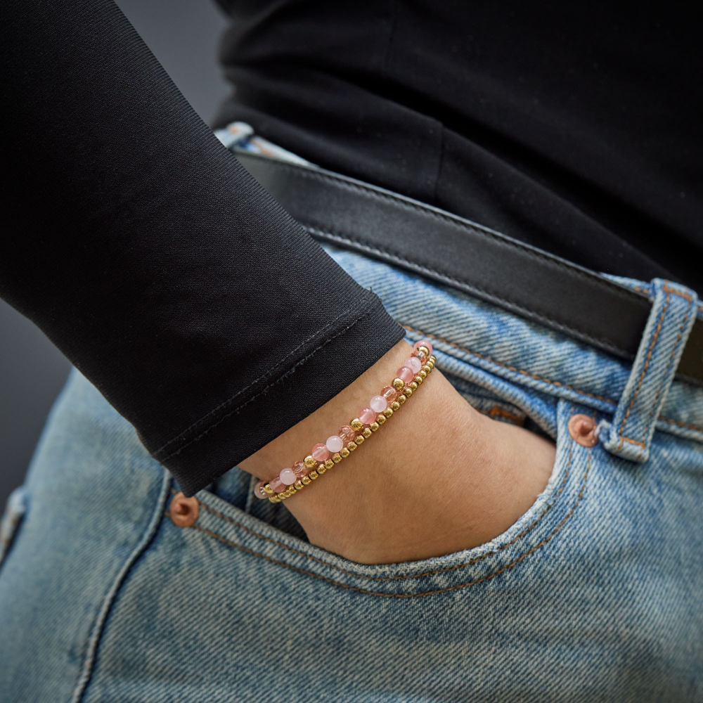 Armband van het merk Rebel & Rose. De armband heeft een hoogwaardige elastische stretch koord, met 4mm van Rozenkwarts, Argentina Rhodoniet, RVS ion-gold plated, Glas Rock.