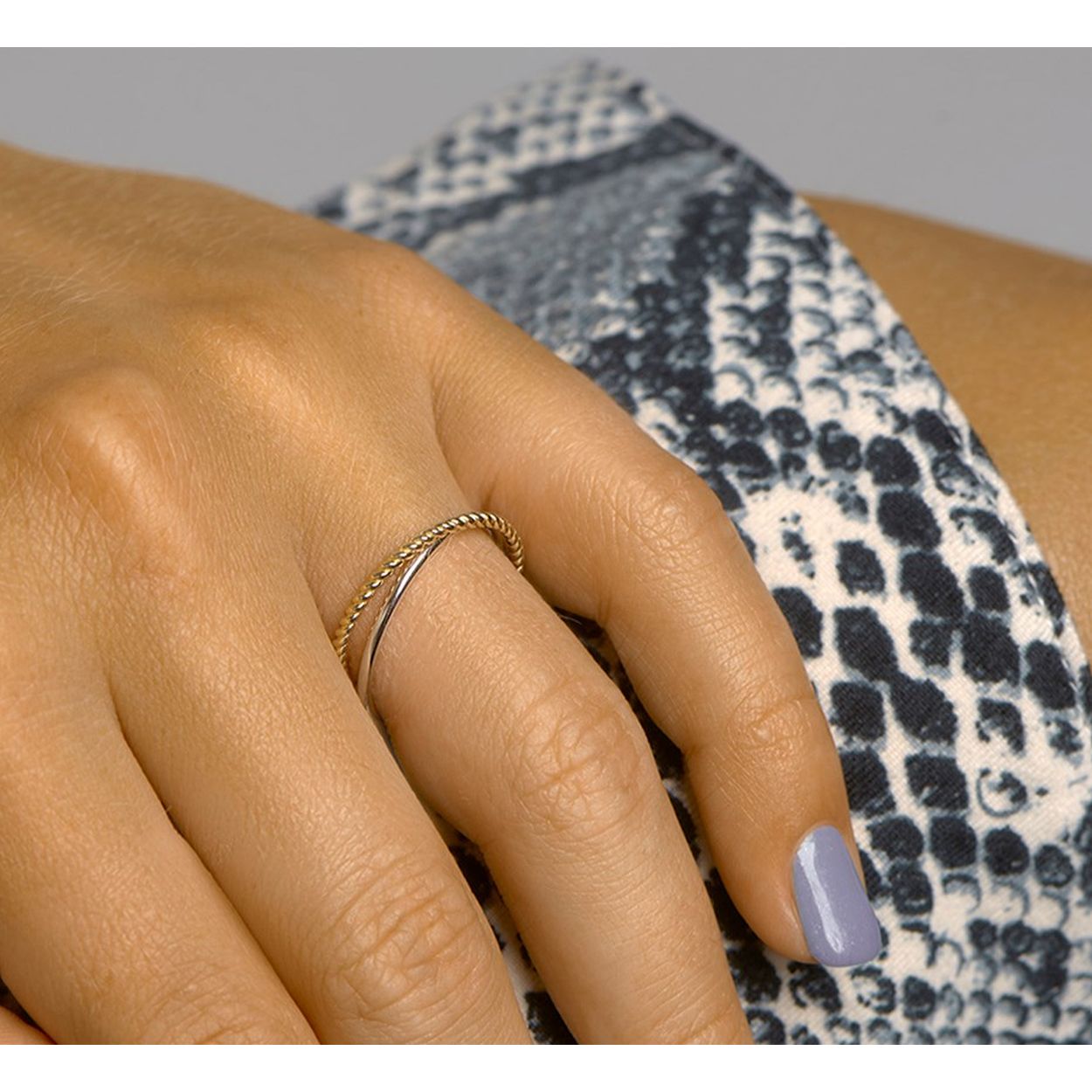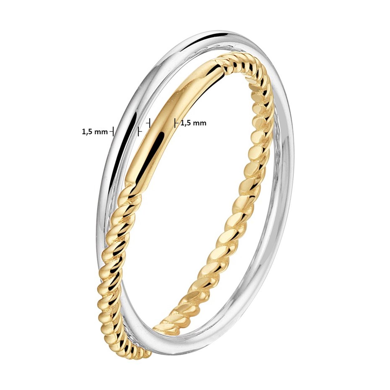 14k Bicolor geel- en witgouden ring bestaande uit twee in elkaar gedraaide ringen. Beide ringen hebben een breedte van 1.5mm.