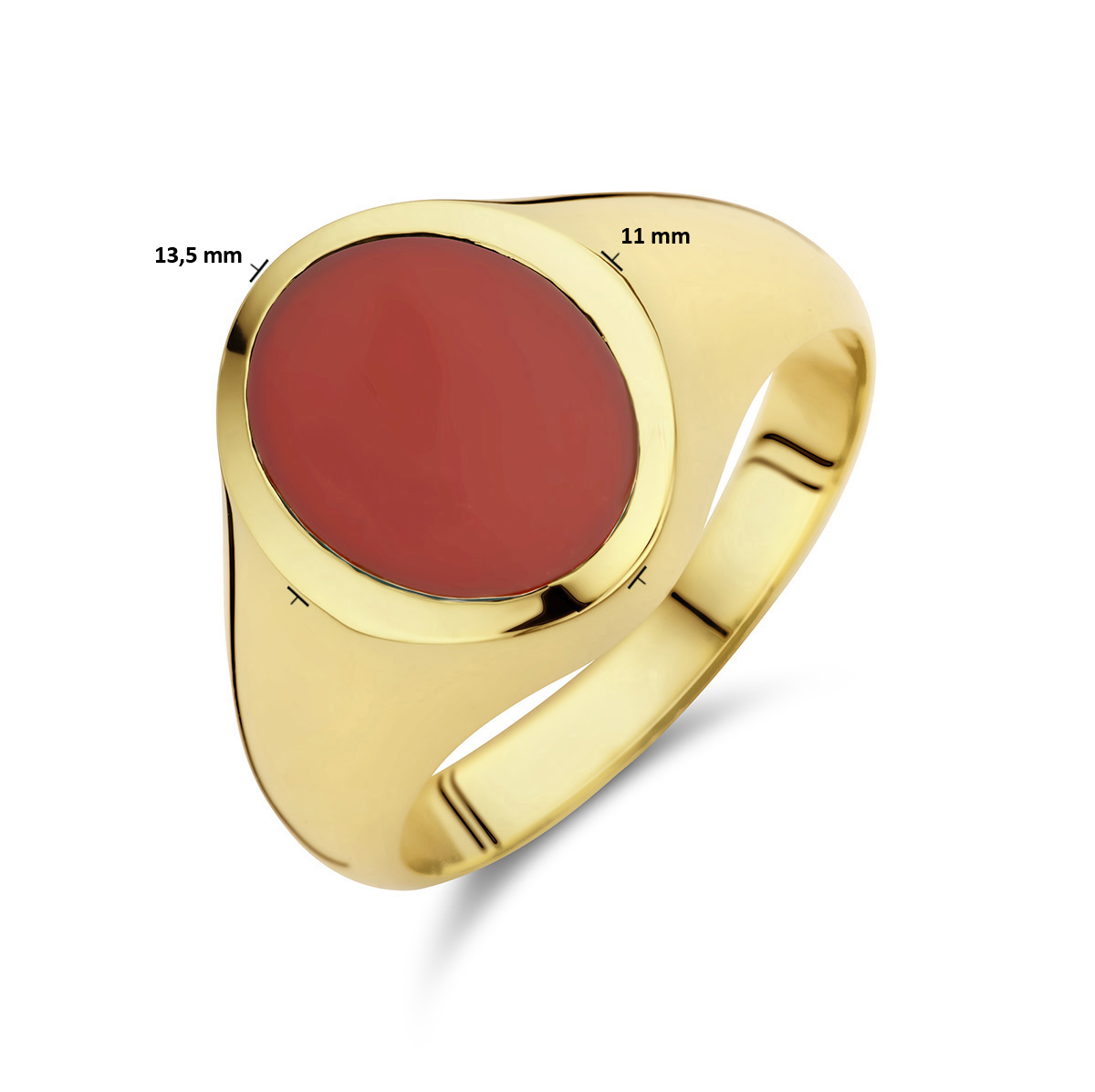 14k Geelgouden ring uitgevoerd met een schitterende carneool. De ring heeft een afmeting van 13.5x11mm. De carneool heeft een steengewicht van 1.67ct.