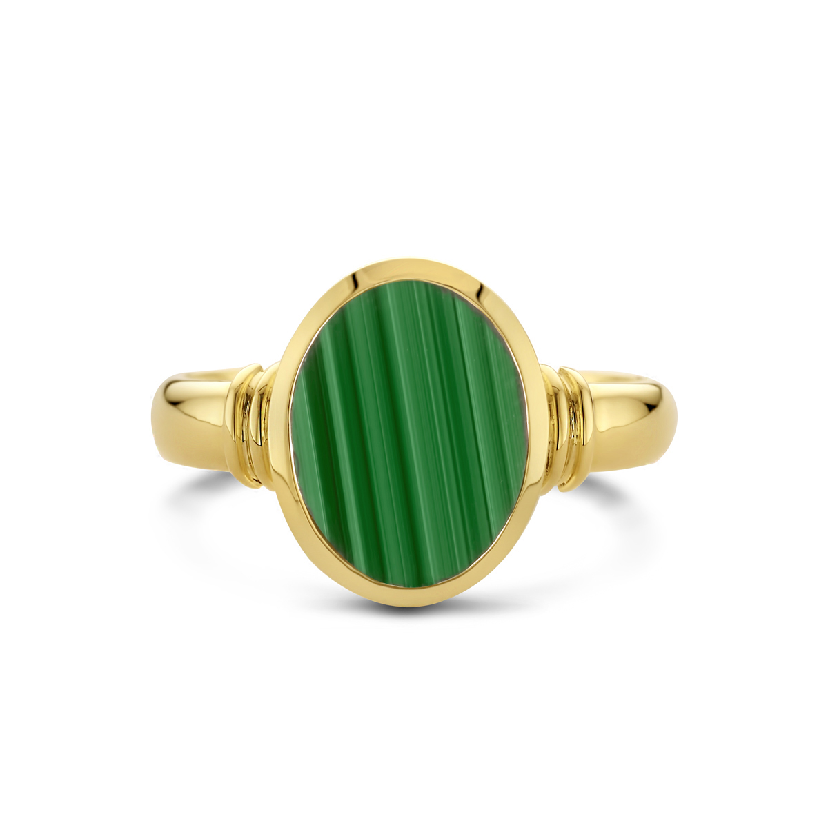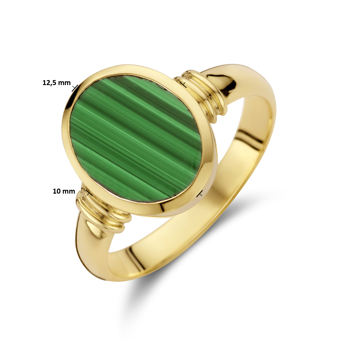 14k Geelgouden ring uitgevoerd met een schitterende malachiet. De ring heeft een afmeting van 12.5x10mm.